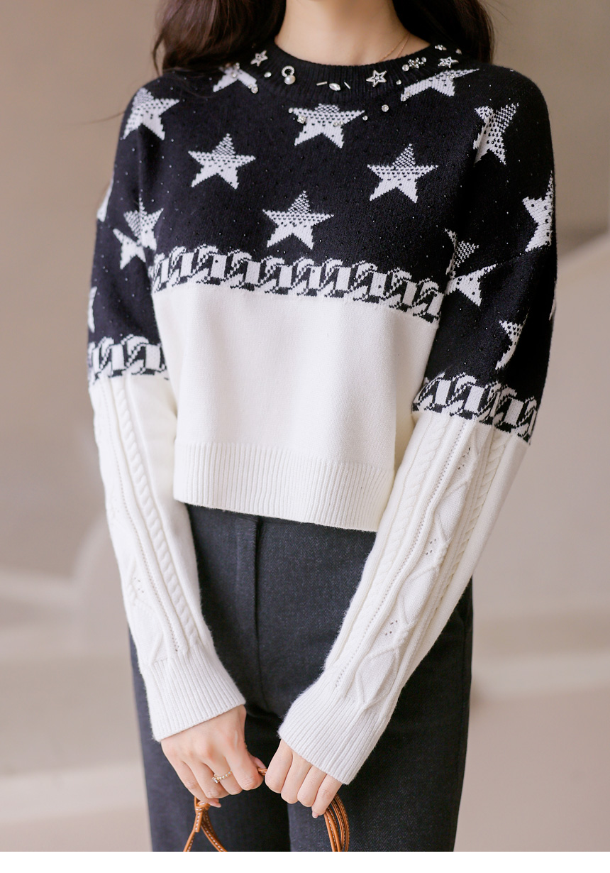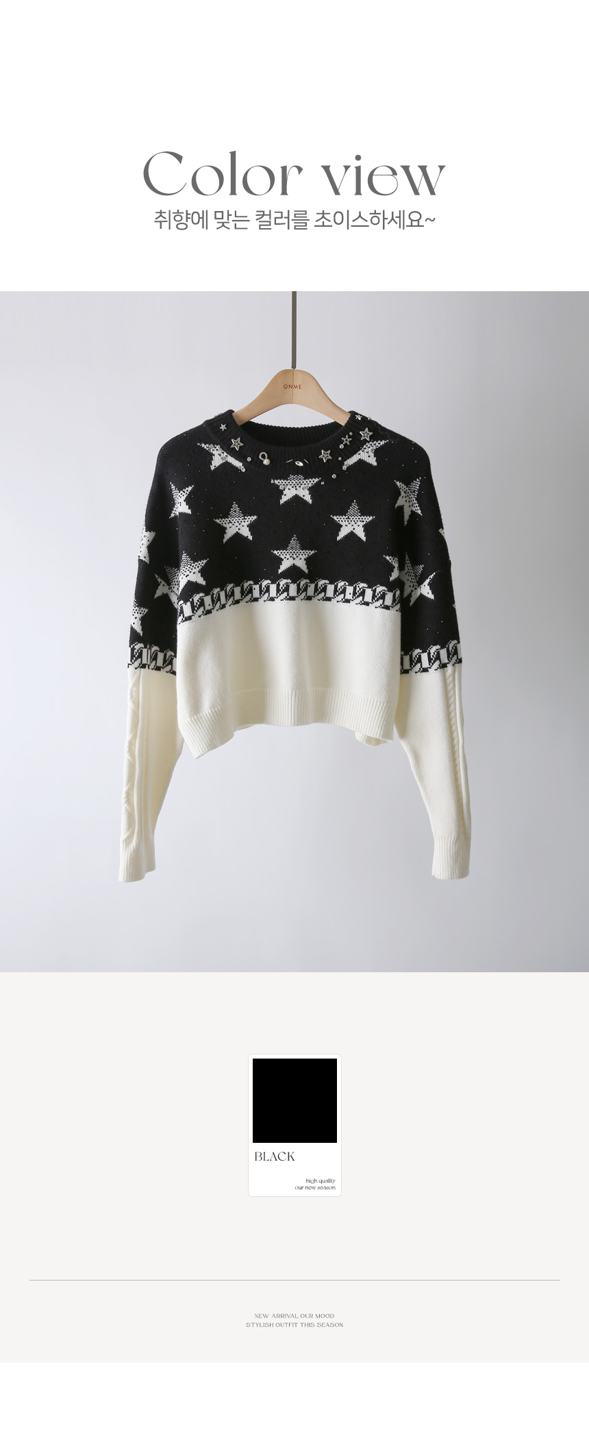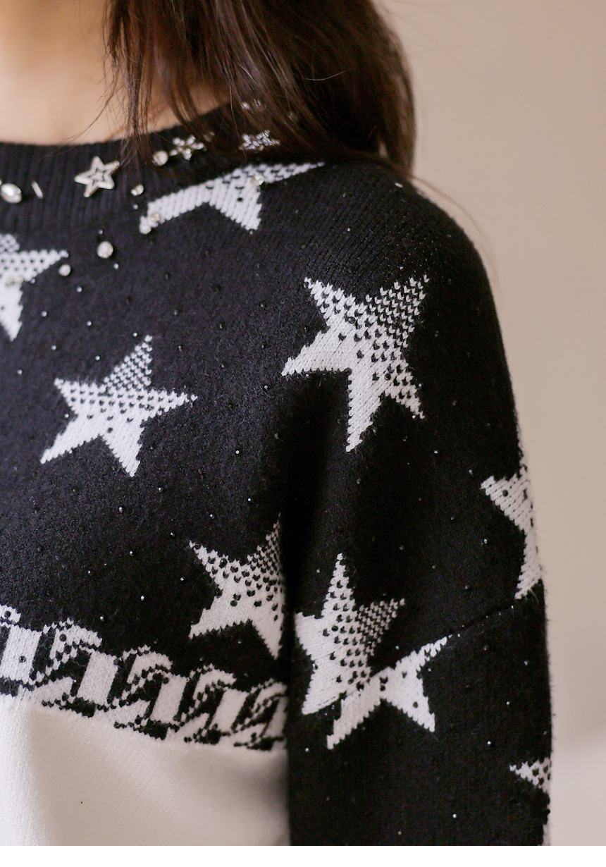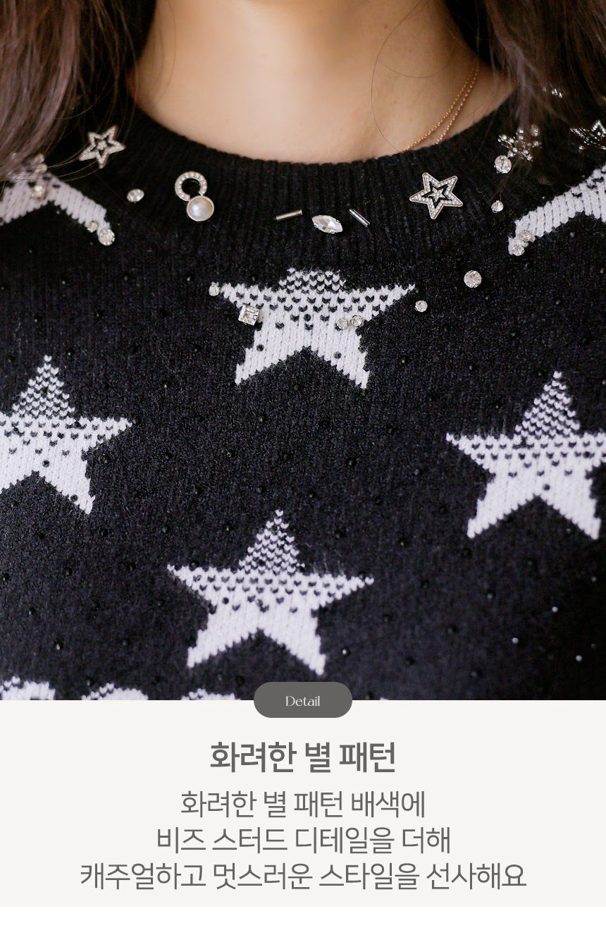 별 패턴 배색에 핫픽스와 스터드 장식으로 스타일리시한 포인트를 준 니트에요 :)