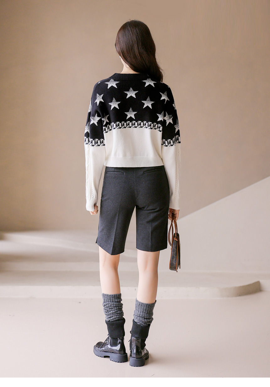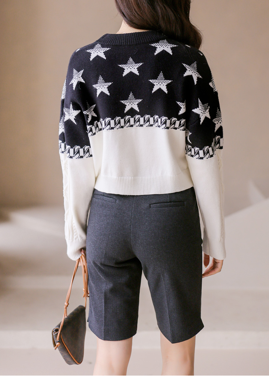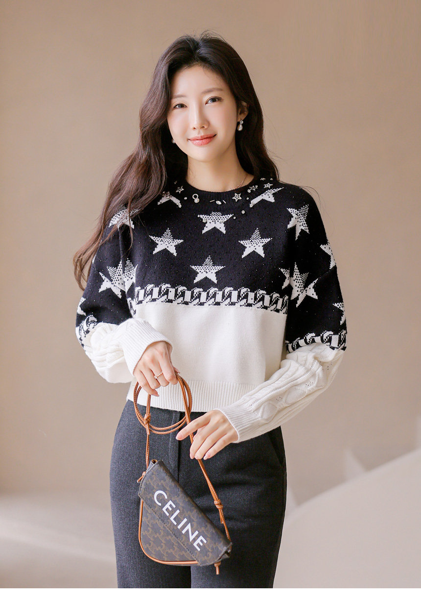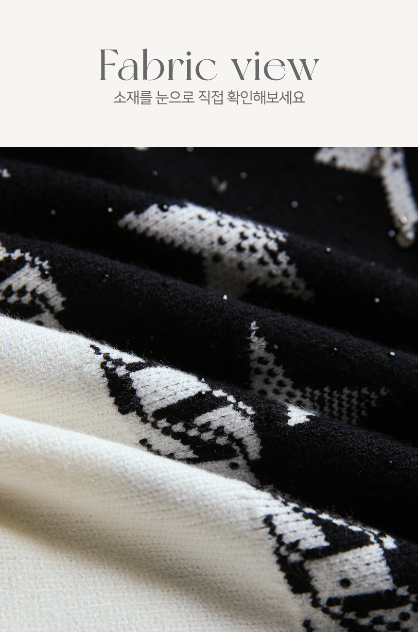 별 패턴 배색에 핫픽스와 스터드 장식으로 스타일리시한 포인트를 준 니트에요 :)