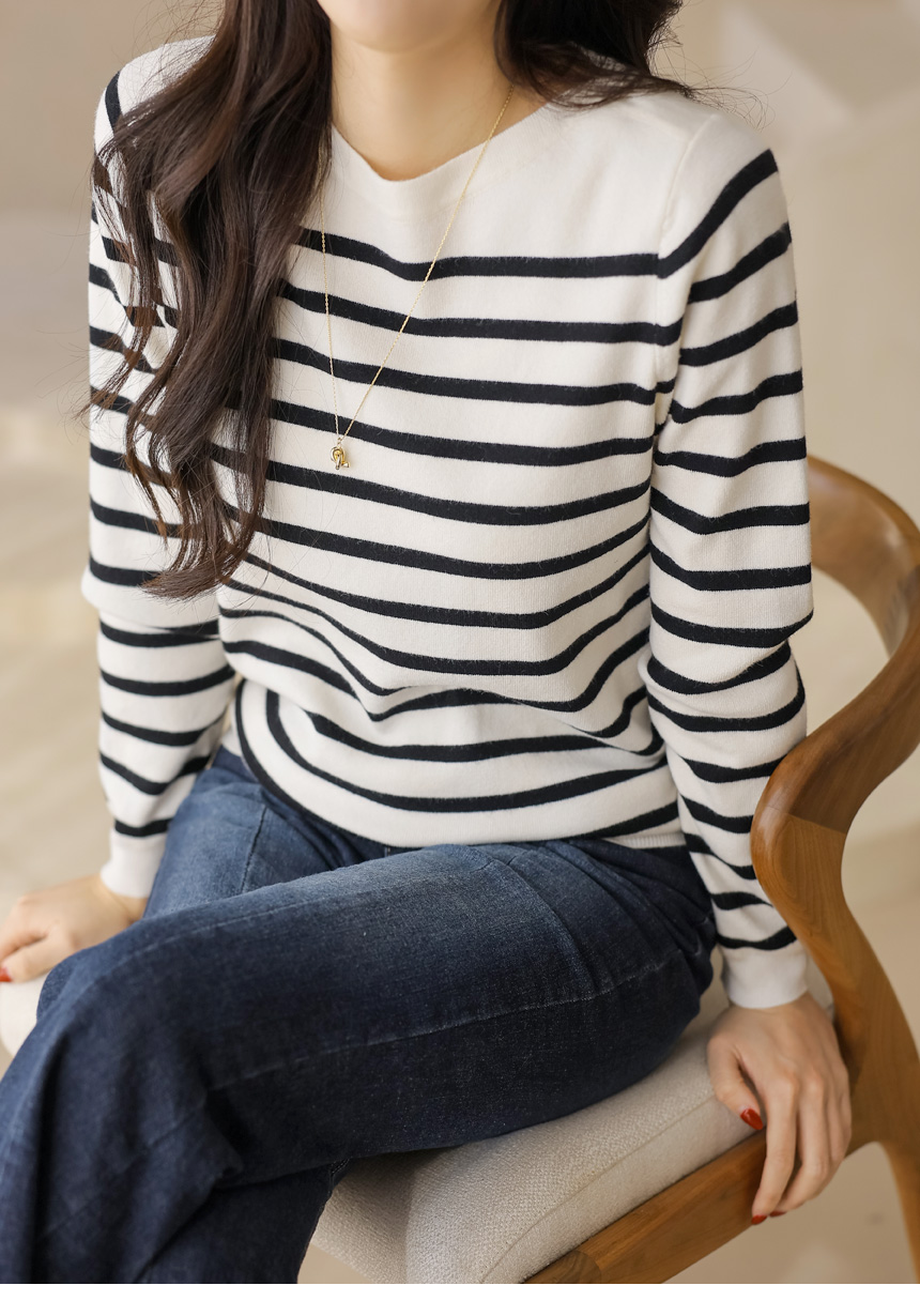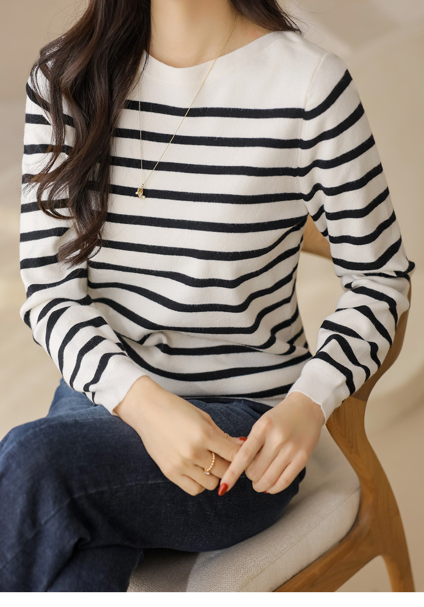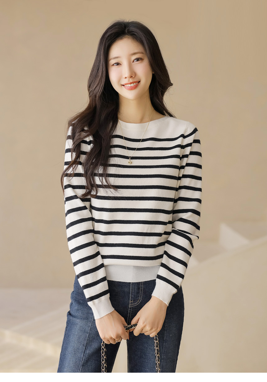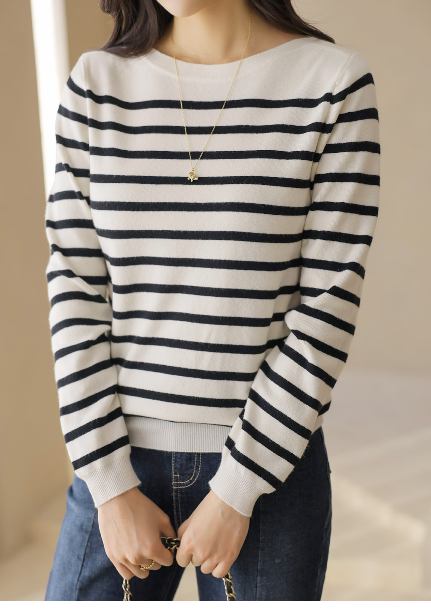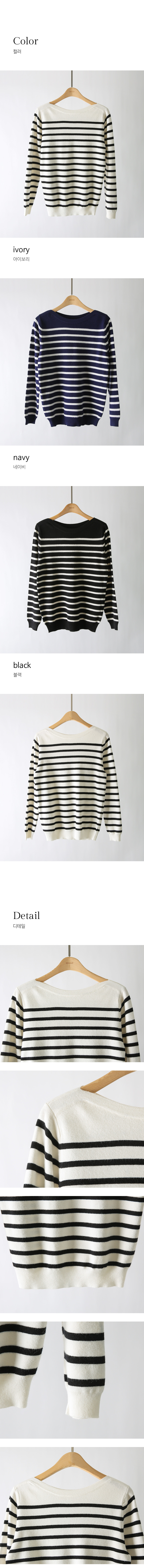 데일리로 즐기기 좋은 스트라이프 보트넥 니트예요 :)