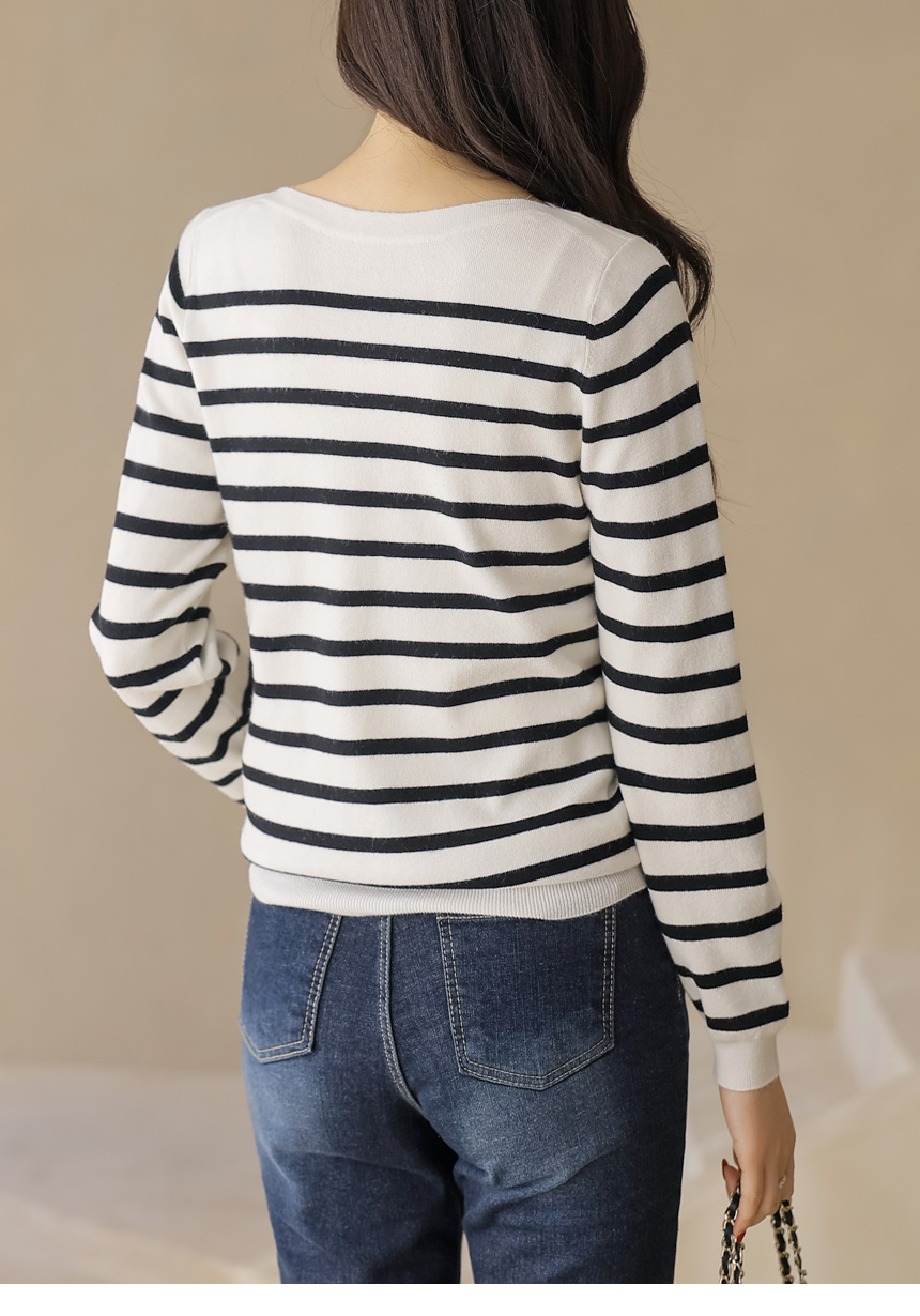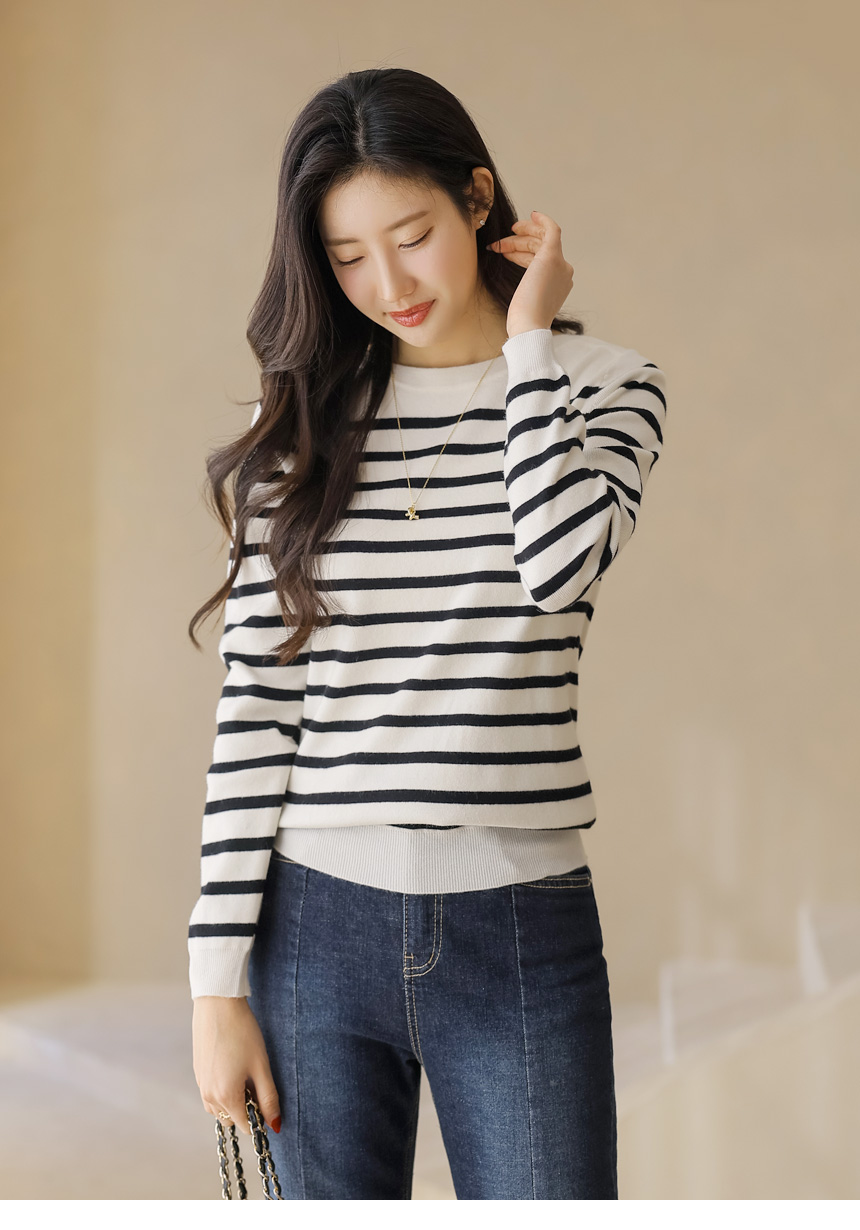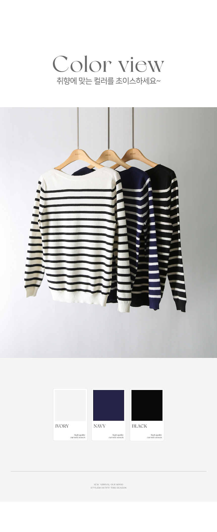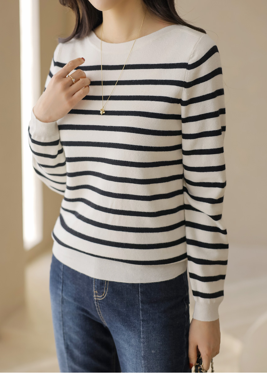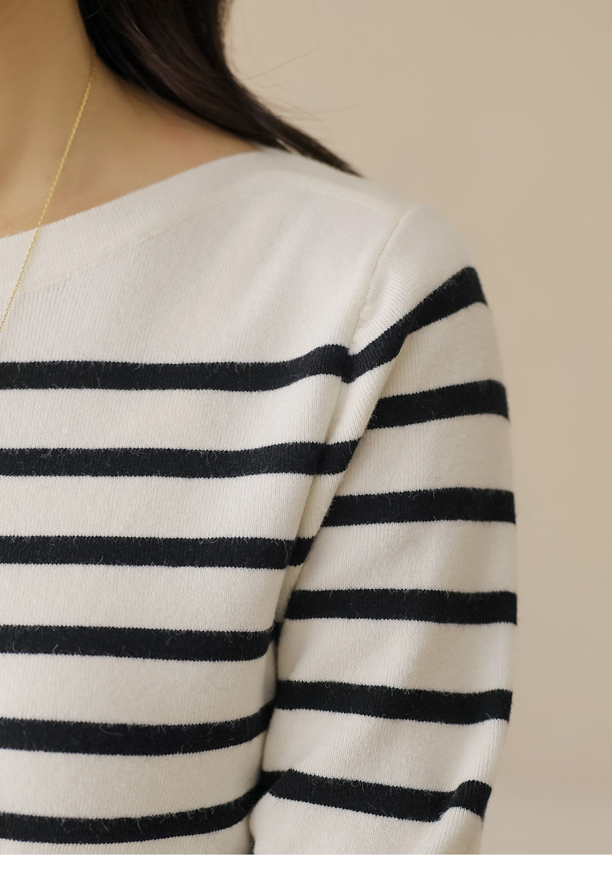 데일리로 즐기기 좋은 스트라이프 보트넥 니트예요 :)