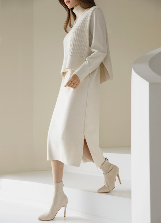 【2点特価】ハイネックケーブルニットベスト&サイドスリットロングニットワンピース セットアップ SET11320