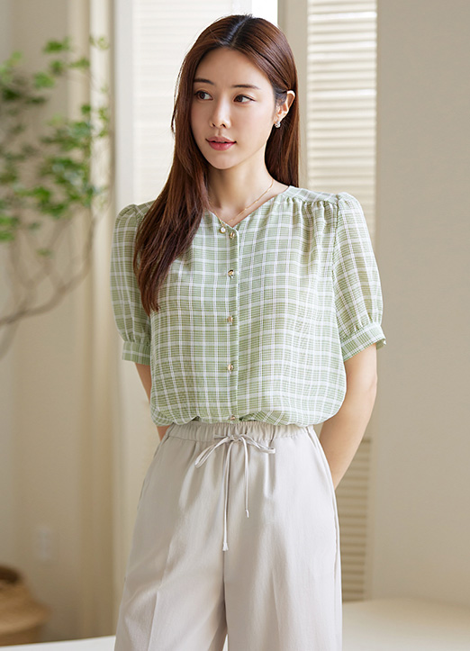 [Louis Angel] Ⅴネックシャーリングシアーチェックブラウス bl26327