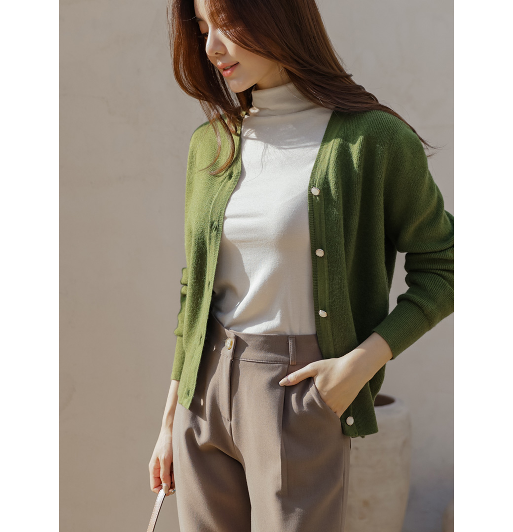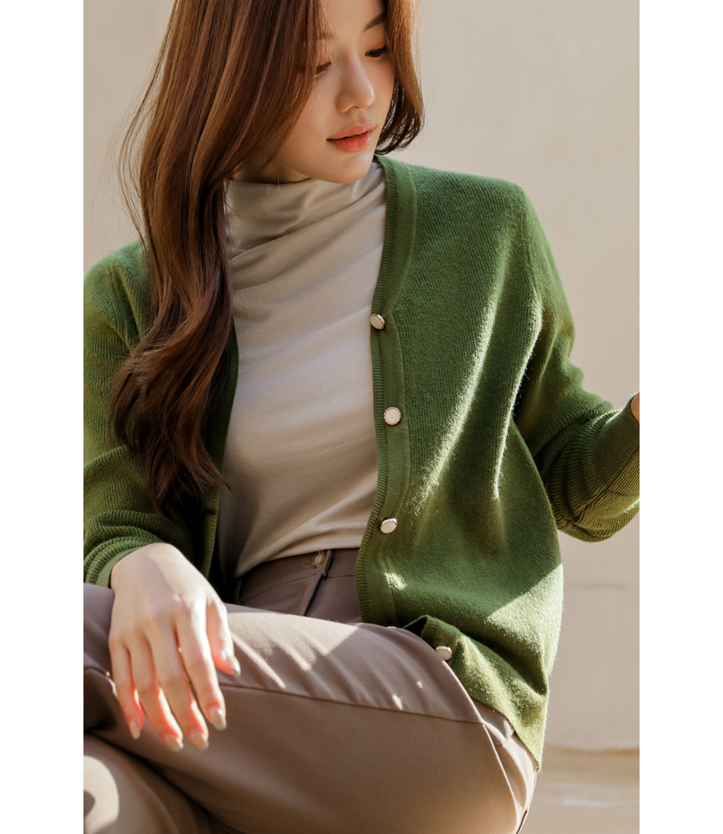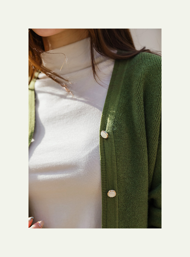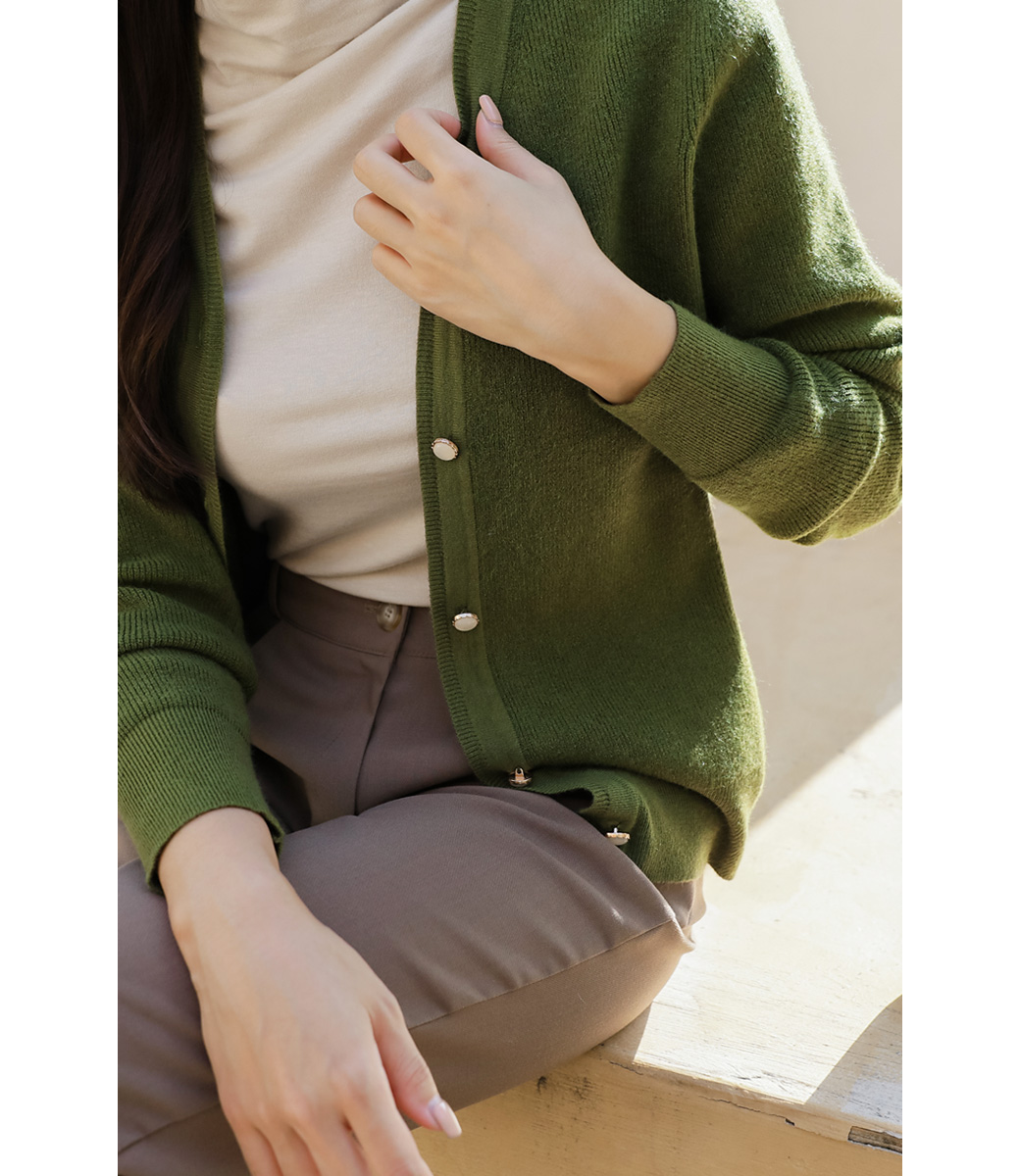 カシミヤブレンドの保温性のあるカーディガン。カーディガン自体はシンプルなデザインでデイリーからオフィス、格式ばった席まで幅広いシーンで着まわしていただけるアイテム◎ビジューボタンがさりげないポイントです♬