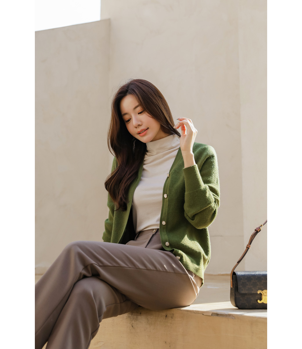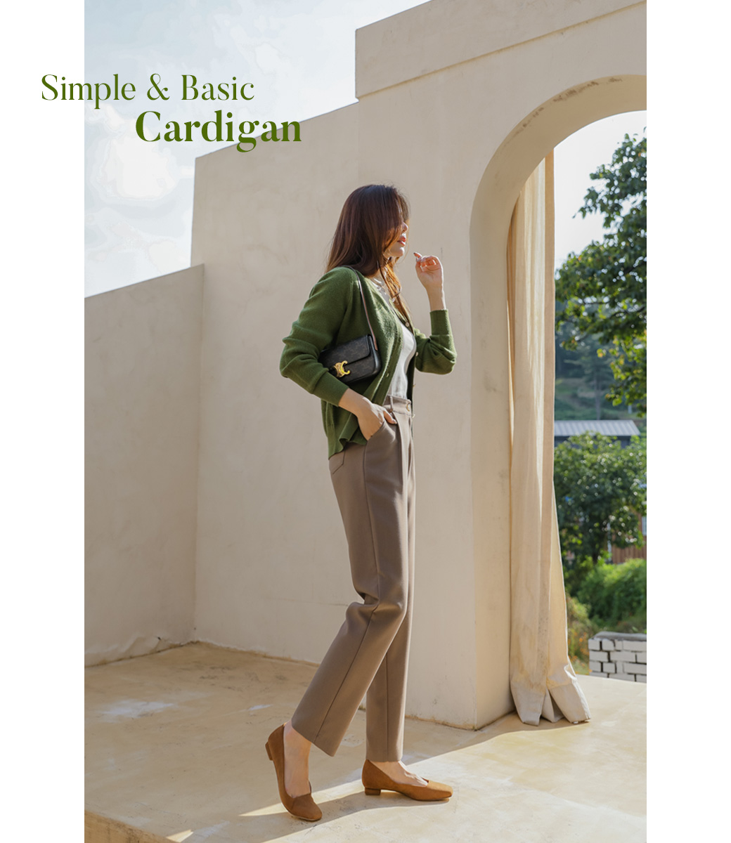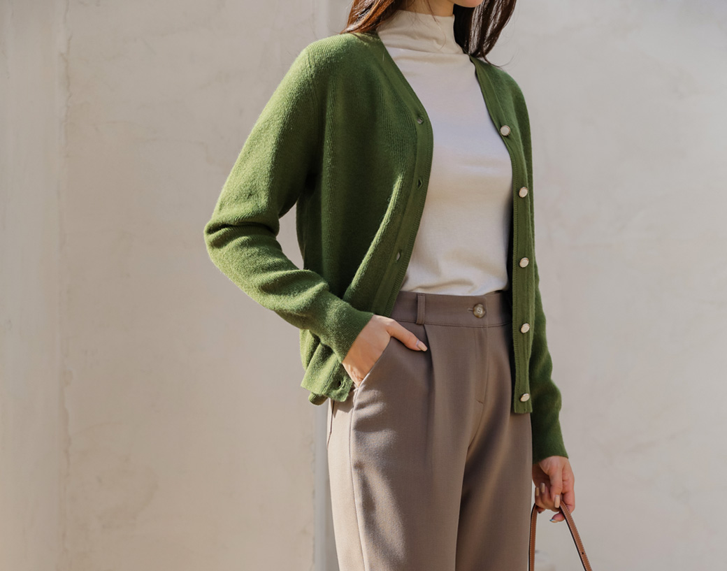 カシミヤブレンドの保温性のあるカーディガン。カーディガン自体はシンプルなデザインでデイリーからオフィス、格式ばった席まで幅広いシーンで着まわしていただけるアイテム◎ビジューボタンがさりげないポイントです♬
