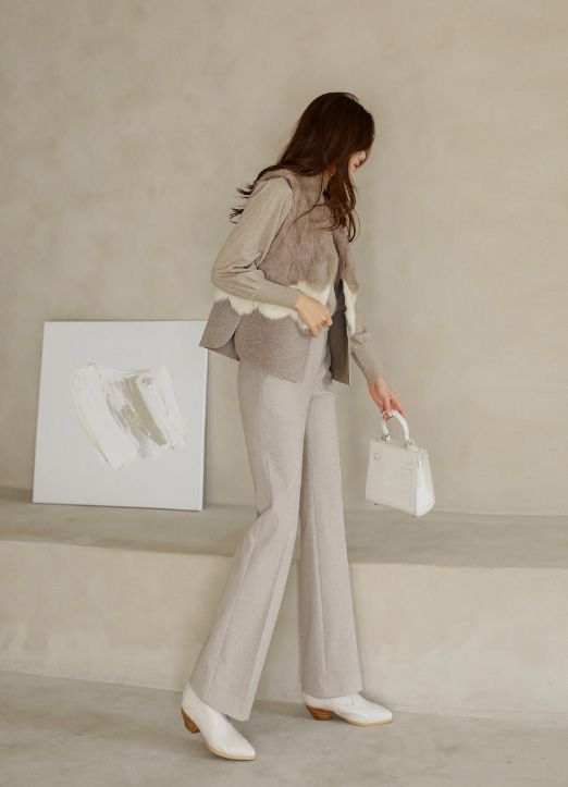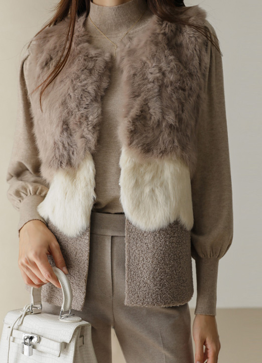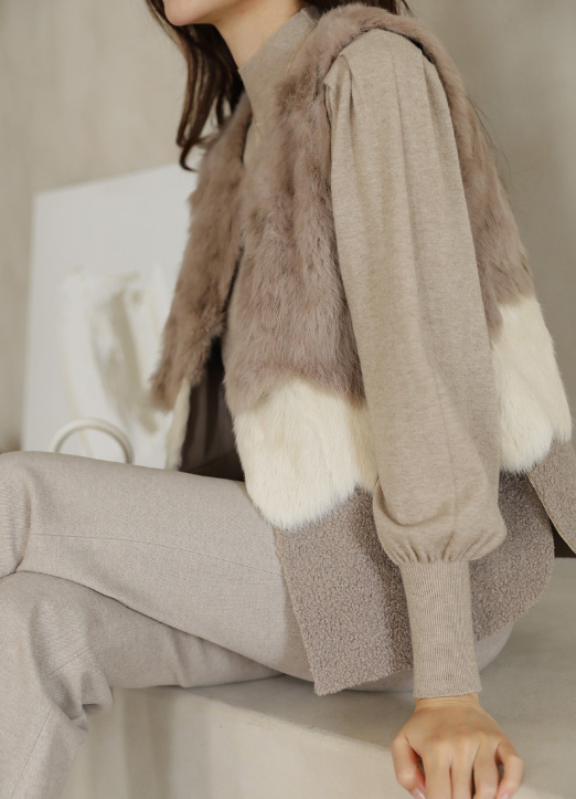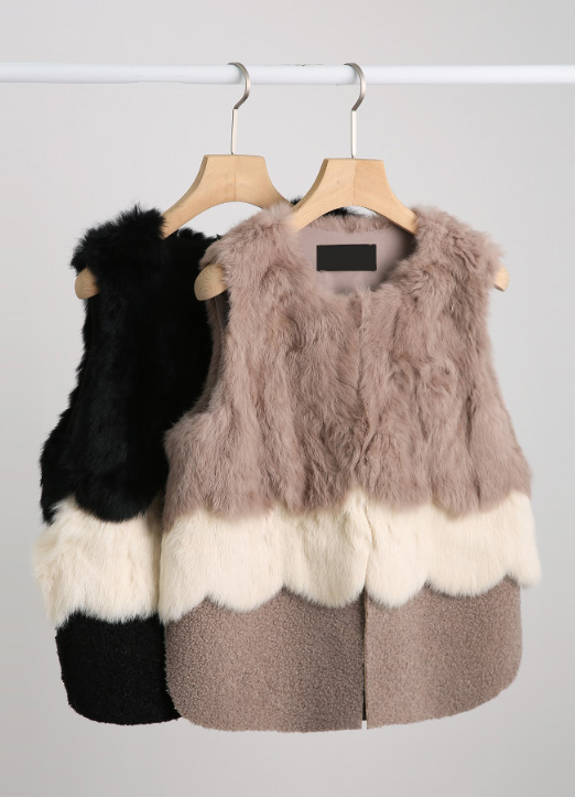 この季節にピッタリ!上品リッチ雰囲気を完成するラビットーファーベストです。ふわふわの100%ラビットーファー生地を使用し、ずっと触れていたくなる心地よさがうれしい! 3段にかけてカラー、素材が異なるスカラップ模様の配色が、ユニークでラブリーなムードを演出します。 デートの時や少しオシャレになりたいとき、オフィスルックなど様々なシーン活躍!いつものコーデにプラスすることで、簡単に女性らしく軽やかな印象を与えてくれます!