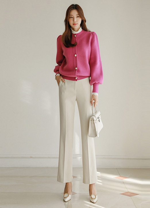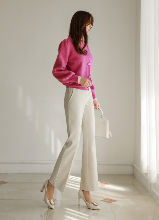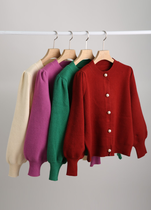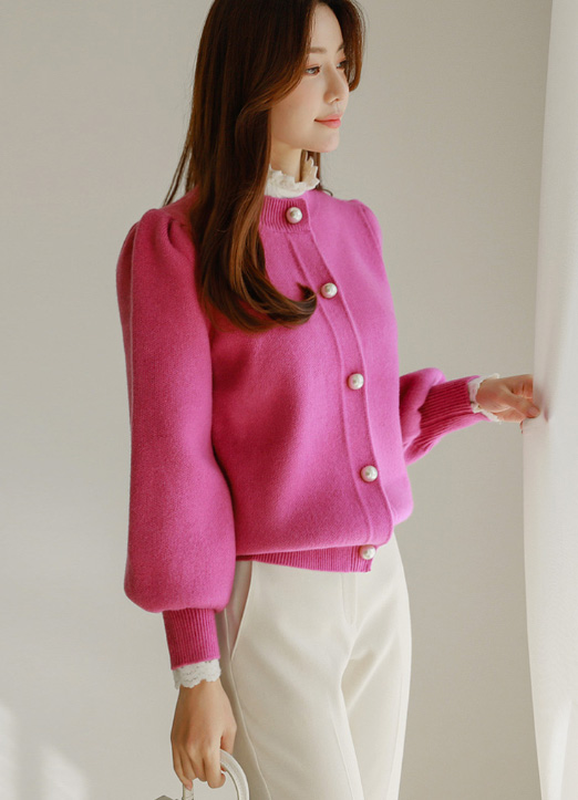 フロントのビックパールボタンが艶やかでがエレガントなカーディガン。 袖のパプデザインがラブリーでフェミニンな表情に。ふわふわなソフト素材感でつい毎日着たくなる!デニムやスカートなど様々なボトムストも相性よく、旬な着こなしができるマストハブアイテムです。