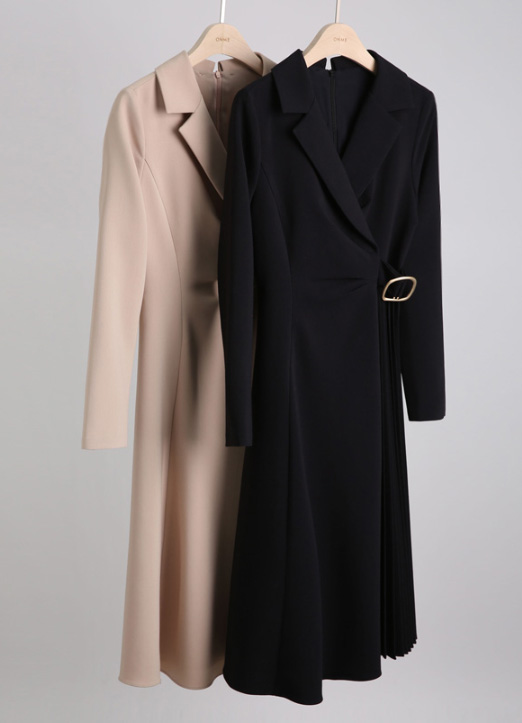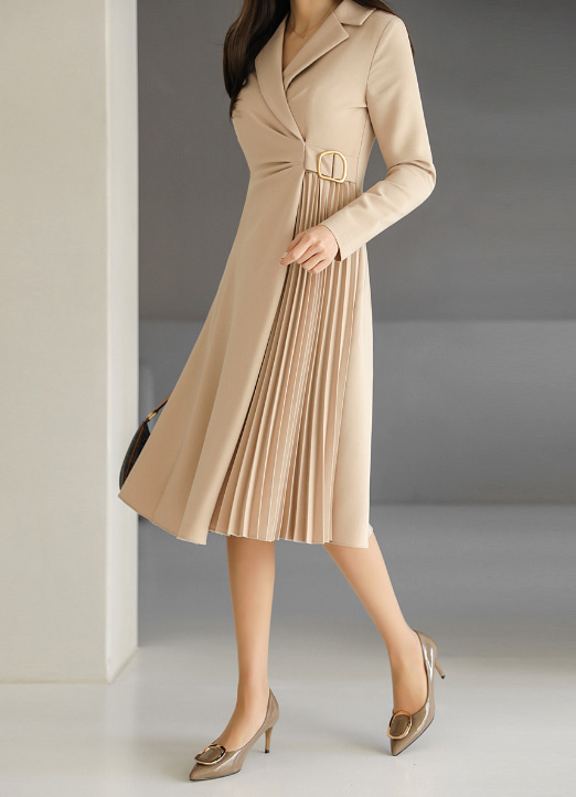 ラップ風のサイドプリーツがユニークな魅力!ハイウエストなので脚長効果抜群◎ サイドのゴールドバックルがウエストマークし、女性らしいメリハリをプラスします。Aラインに広がるプリーツが縦ラインを強調し、なにげなく着痩せ効果も!スリムなシルエットながらも優れた伸縮性のある素材なので動きやすく楽な着心地!S~Lまでサイズが選べるのも嬉しいポイント♪デートからビジネスコーデまで、色んなシーンで使えるおしゃれで大人可愛いワンピースです!