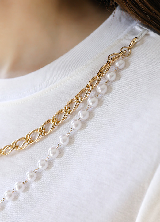 골드 체인과 진주 네클리를 레이어드해서 매치한듯