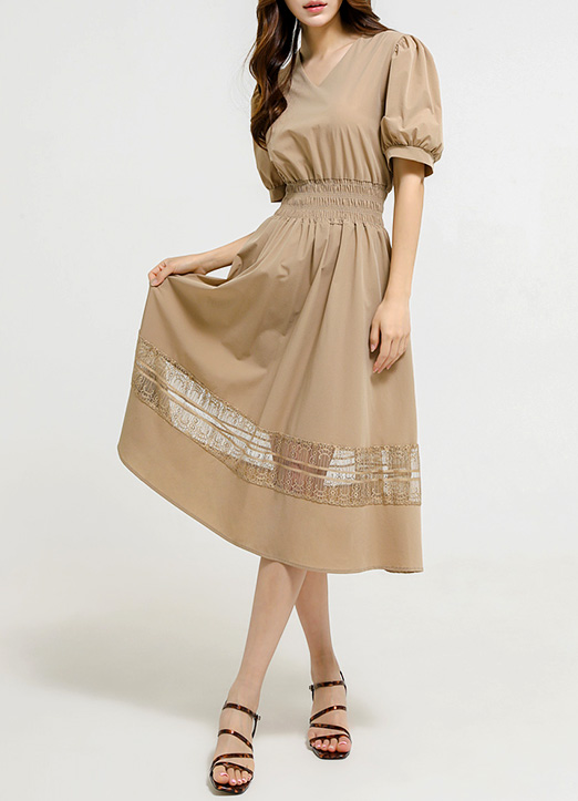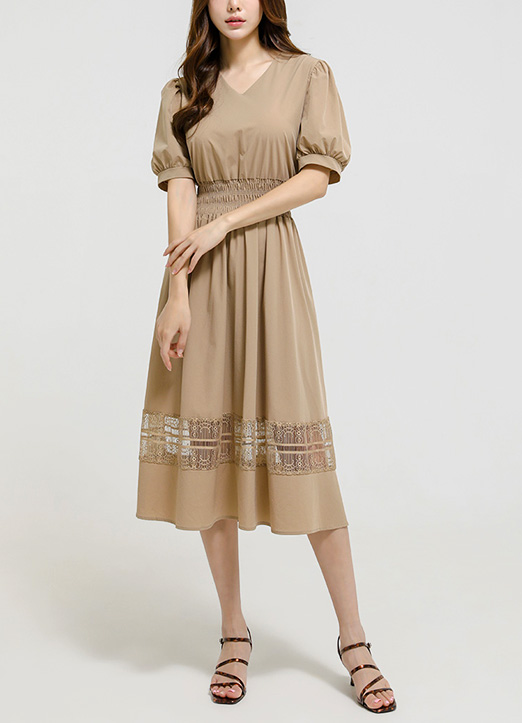 무릎 아래로 내려오는 롱한 길이감에 밑단에 시스루 레이스 배색이 들어가