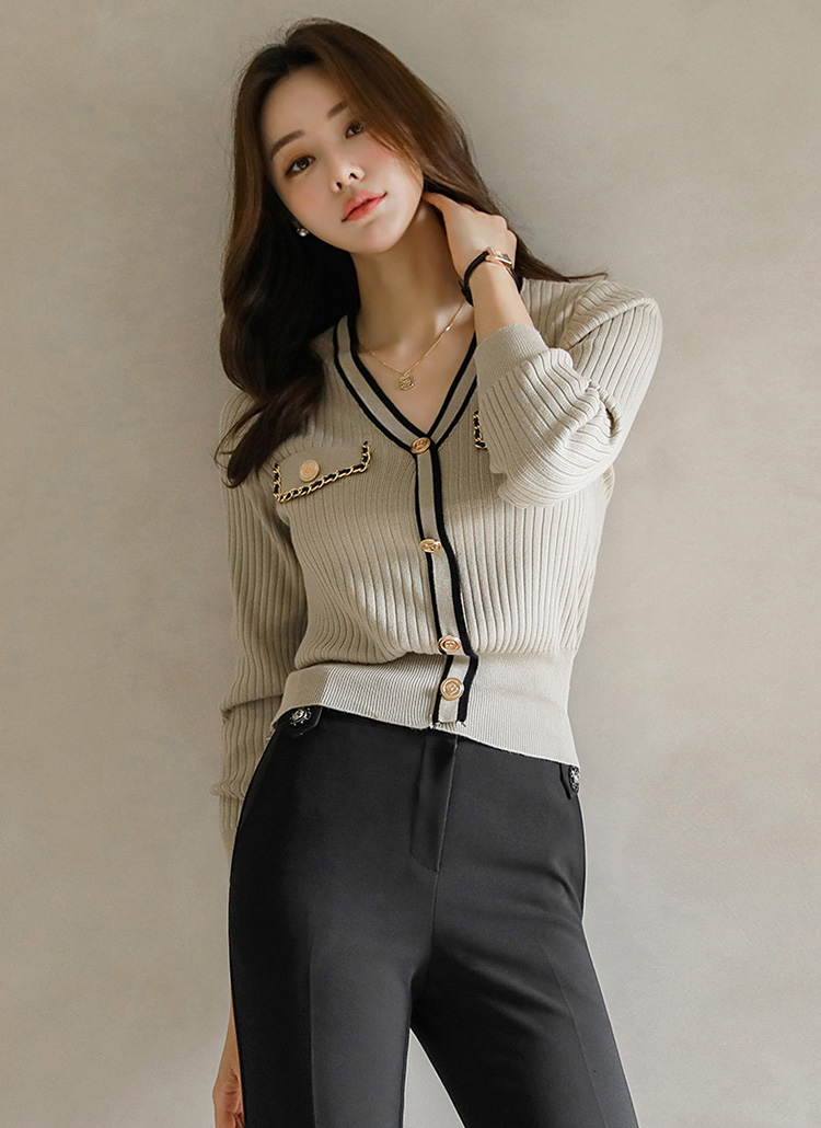 [4色展開] ゴールドチェーン付き カーディガン風バイカラーニットトップス nt18058