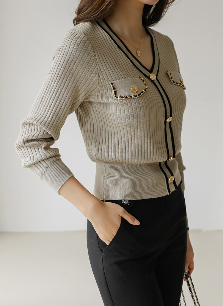 [4色展開] ゴールドチェーン付き カーディガン風バイカラーニットトップス nt18058