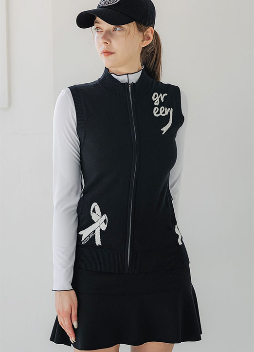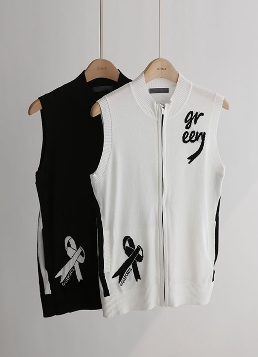 리본 프린팅이 포인트인 집업 니트 베스트에요.
