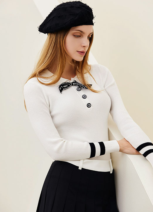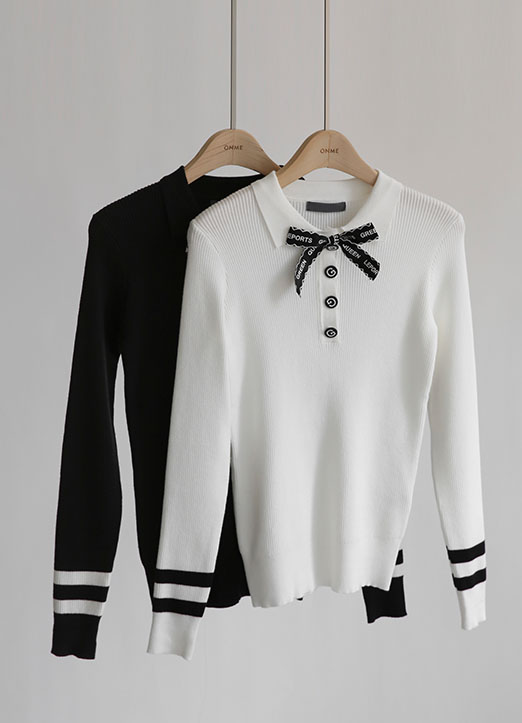 【QoG】[ゴルフウェア] リボンブローチSET バイカラーラインポロ衿リブニット nt19518