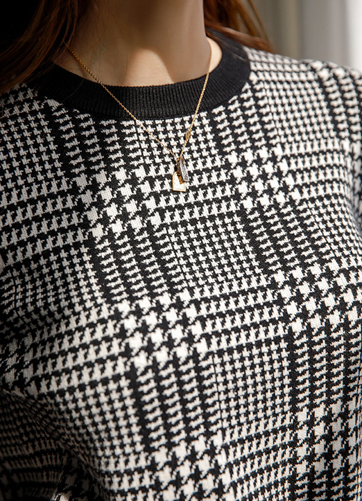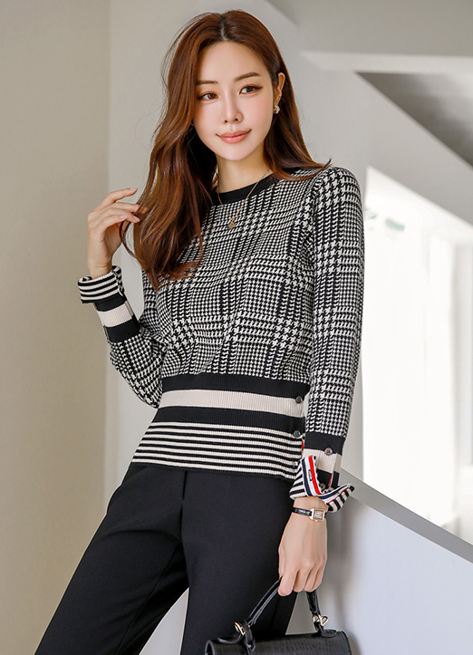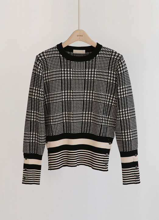 千鳥格子 サイド釦 バイカラーラインニットトップス nt20068