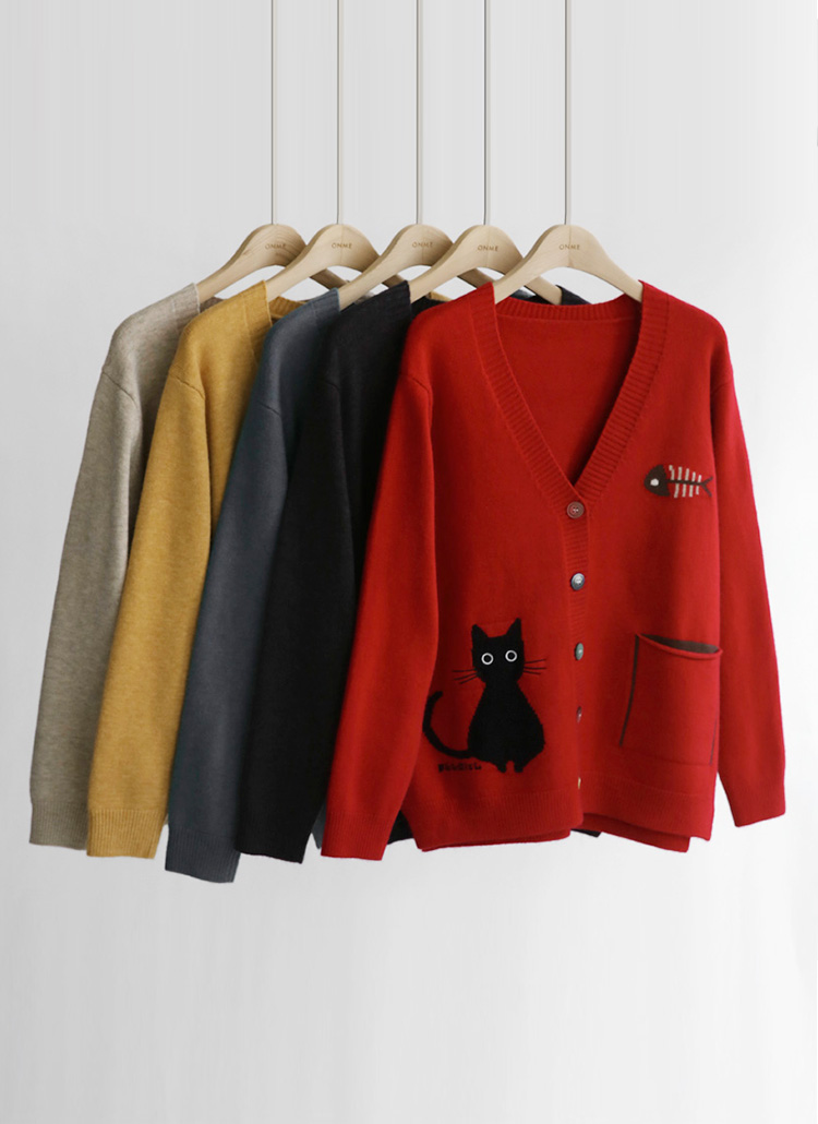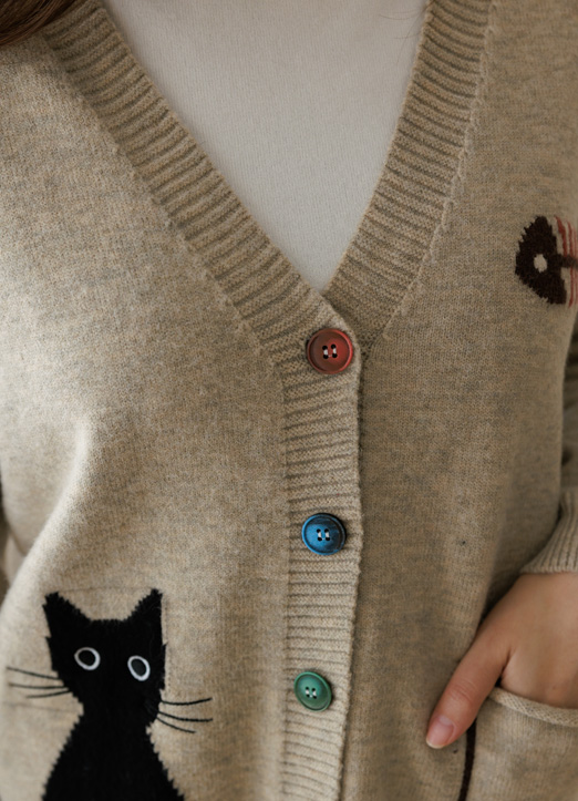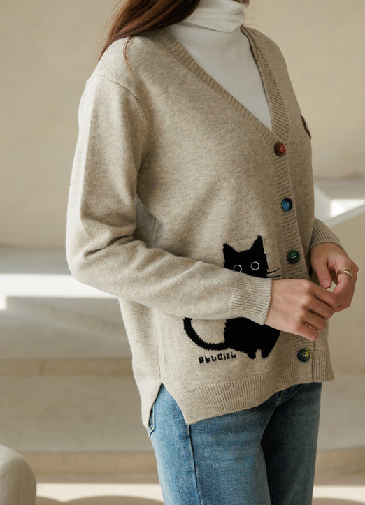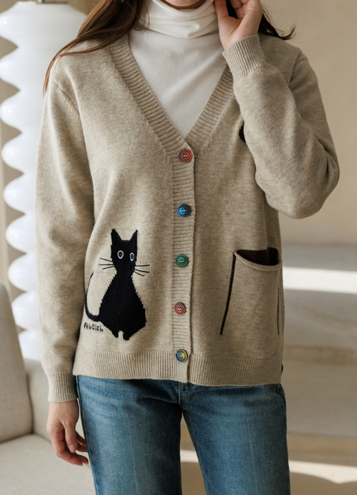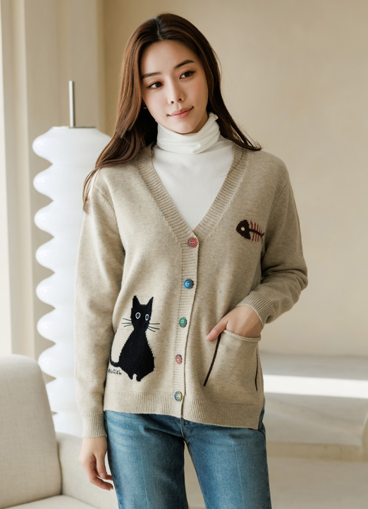 오색단추 고양이 프린팅 V넥 니트 가디건이에요