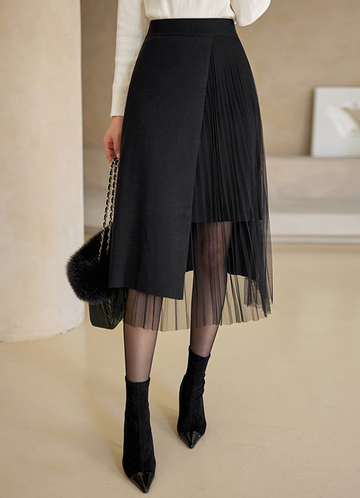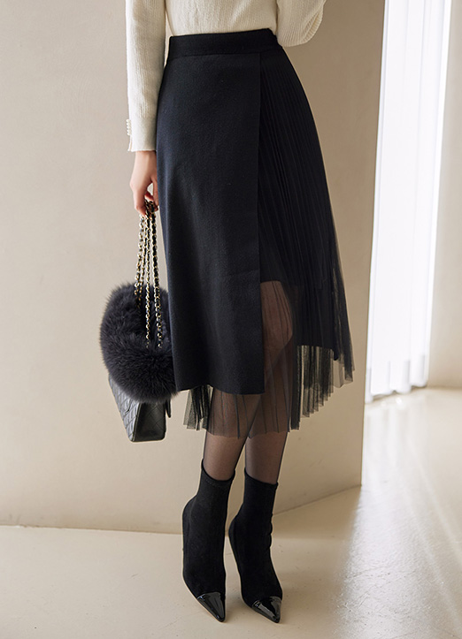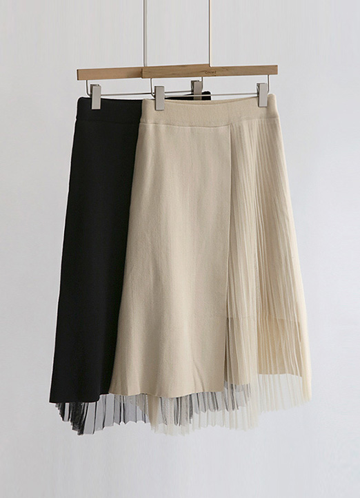 시스루한 샤레이스 플리츠가 배색된 디자인의 니트 스커트에요