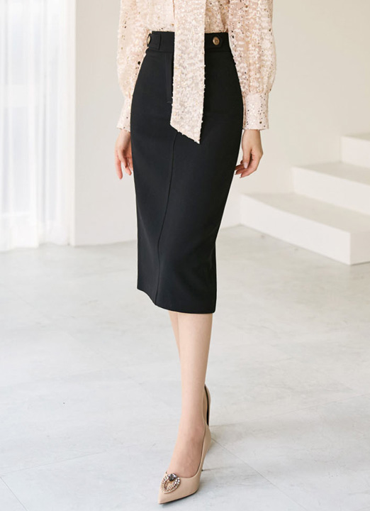 ウエストのゴールド釦がゴージャスなミディアム丈ペンシルスカート。 裏起毛加工で寒い冬の日でも安心♪しっかりとした厚手生地でシワになりにくく、優れた伸縮性があり快適な着心地◎大人オフィススタイルに大活躍するアイテムです!
