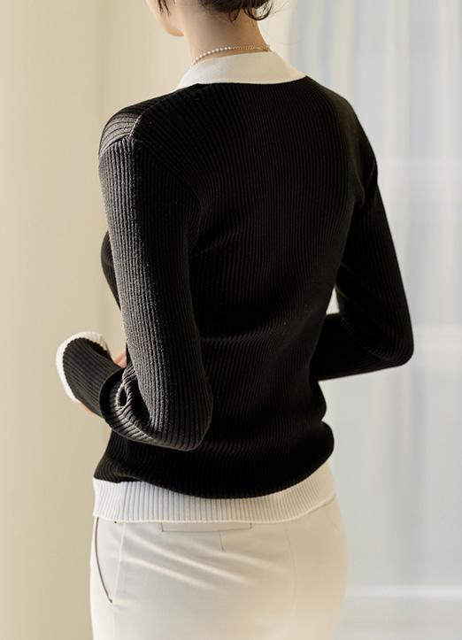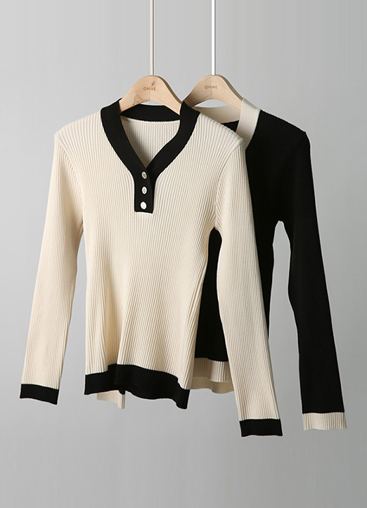 배색과 골드버튼으로 고급스러운 라인을 돋보여주는 니트