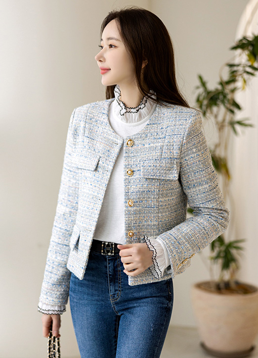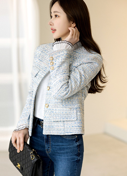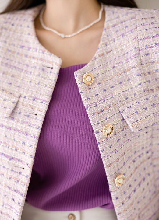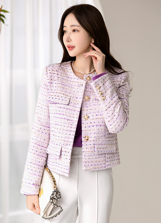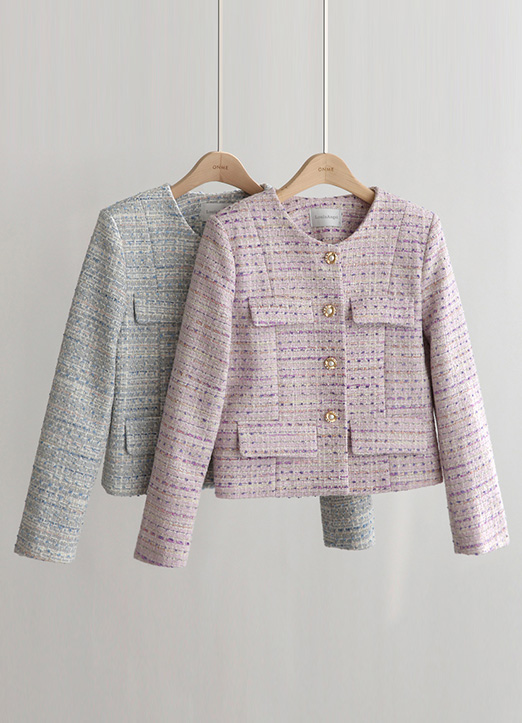 화사한 컬러가 얼굴을 밝혀주며 쥬얼리버튼으로 고급스러운 트위드 자켓