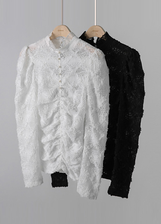 진주 버튼이 포인트로 들어가 우아한 무드를 만들어주는 블라우스에요-
