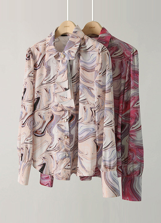 [THE ONME] 2WAY 取り外し可能なボウタイ付きマーブルプリントブラウス bl22970