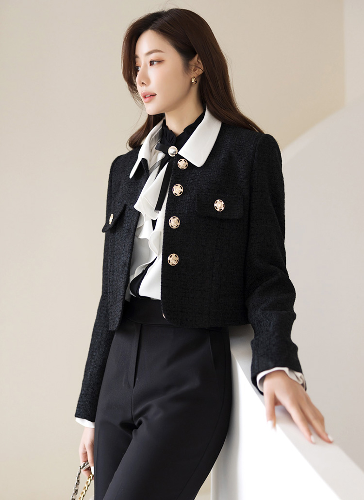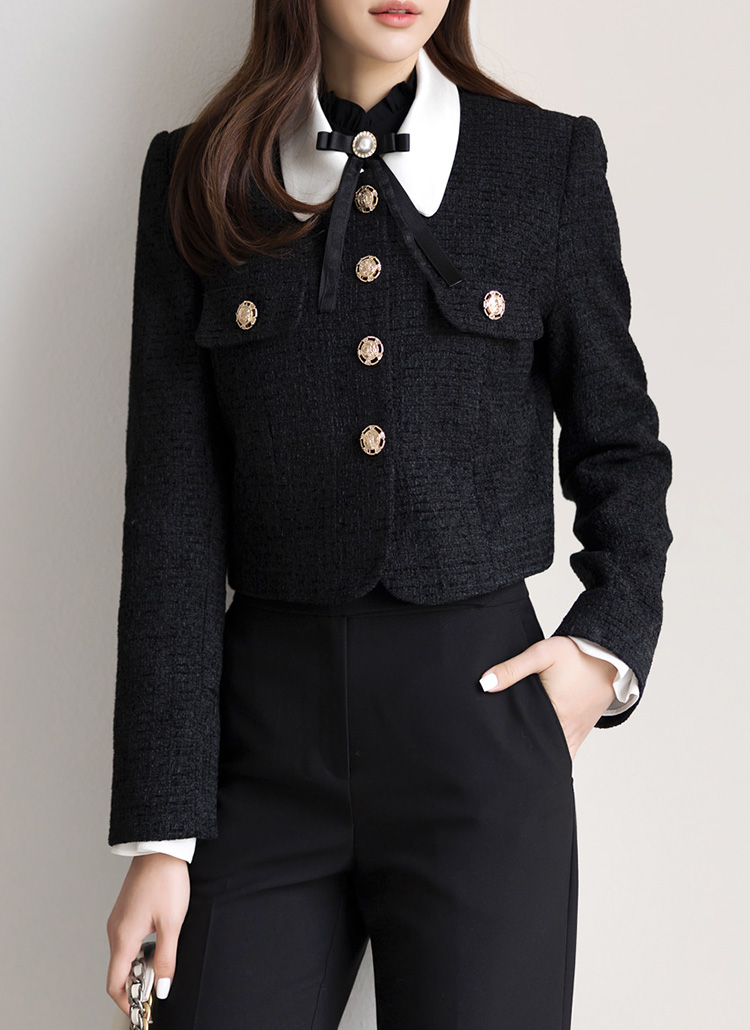 [LouisAngel] 2WAY 取り外し可能なサテン襟付き ゴールド釦 クロップドツイードジャケット jk22982