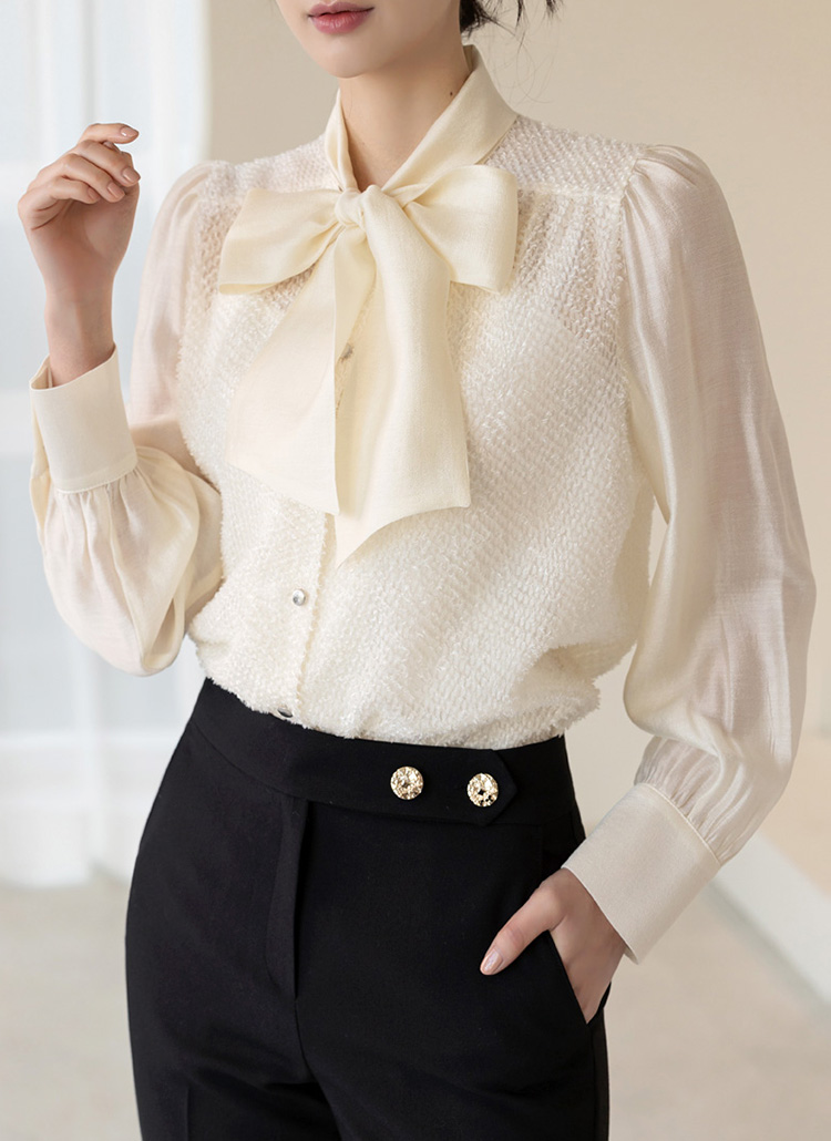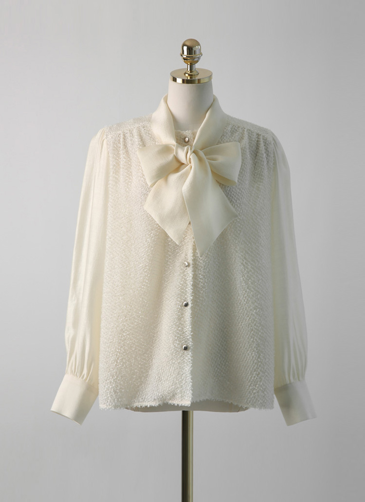 날개사 소재로 화사하게 밝혀주며 리본타이가 페미닌한 무드를 살려주는 블라우스