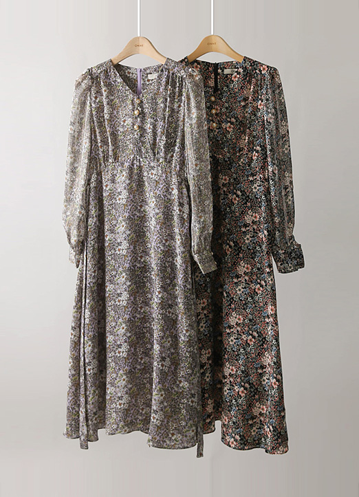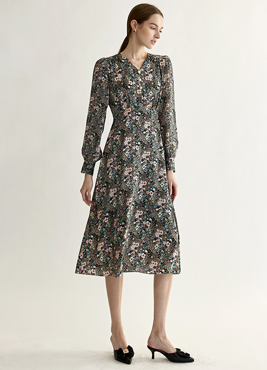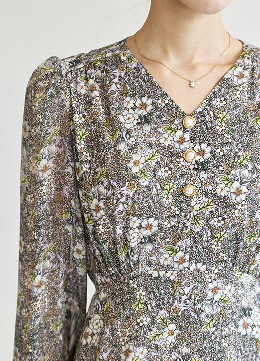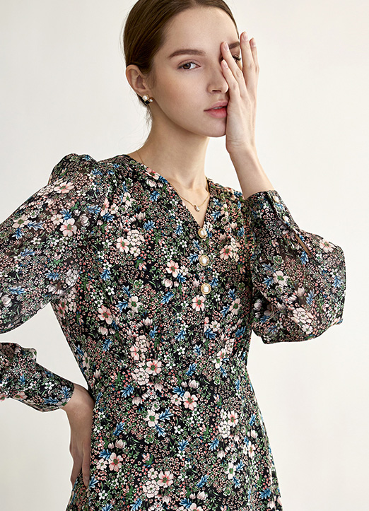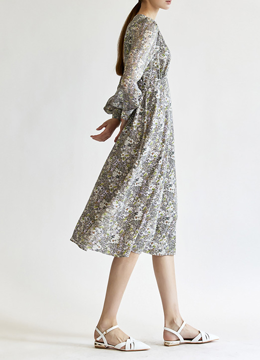 [THE ONME] シアースリーブ切り替えハイウエストフラワーワンピース op23107