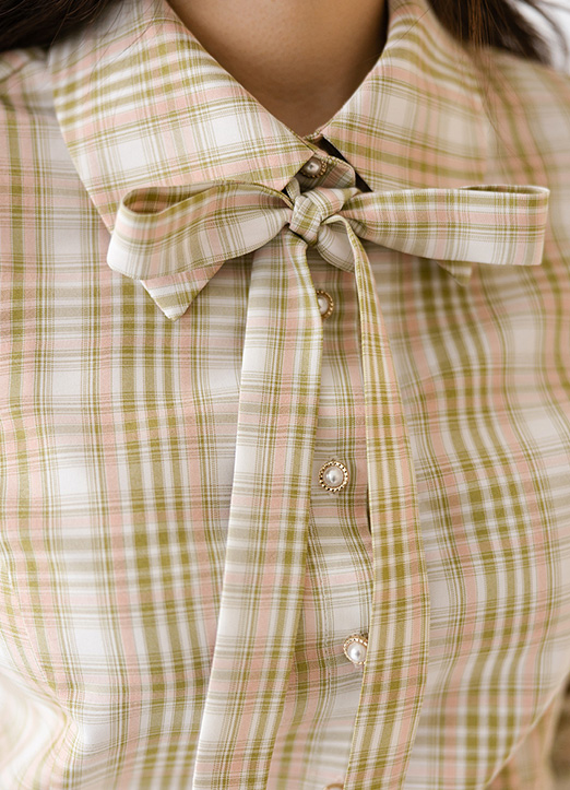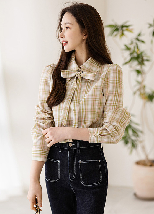 [Louis Angel] 取り外し可能なリボンタイ付きパフスリーブチェックブラウス bl23255