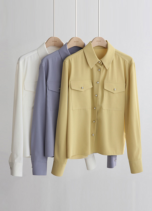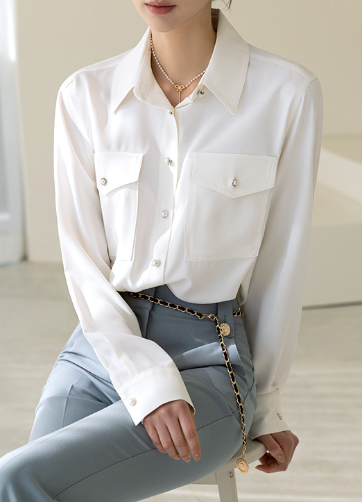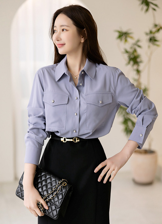 빅포켓으로 캐주얼하면서 진주버튼이 페미닌함까지 살려준 블라우스