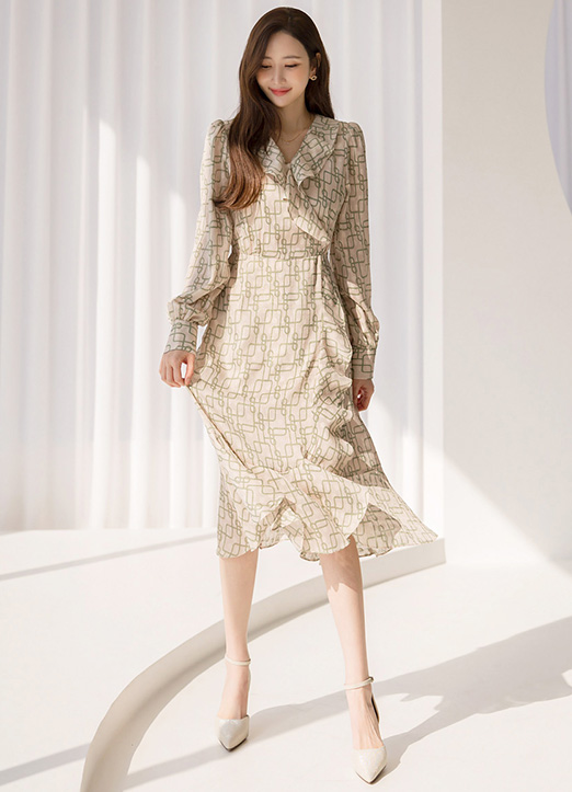 [Louis Angel] 幾何柄シャイニーシフォンフリルワンピース op23427
