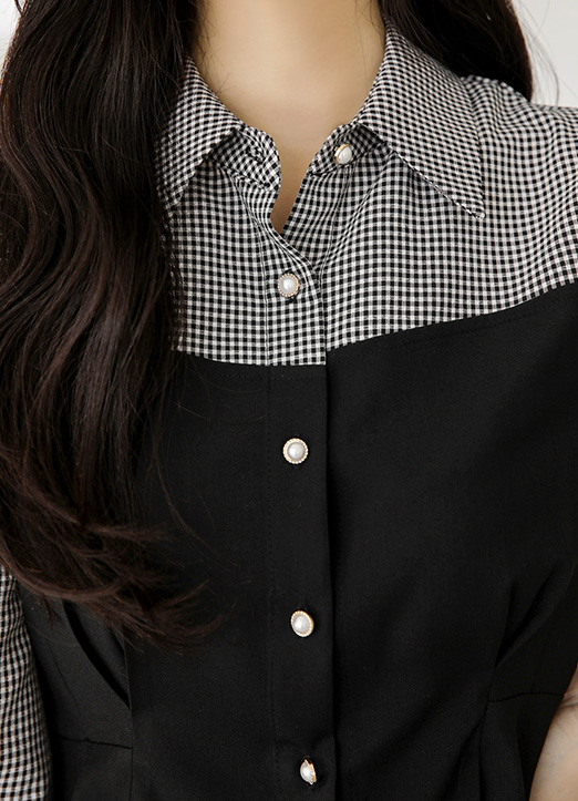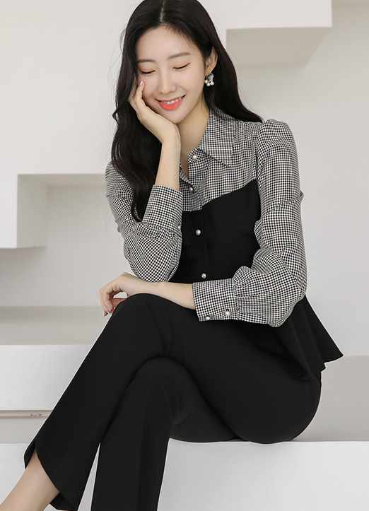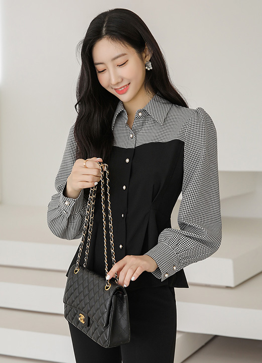 [Louis Angel] 配色チェックウエストタックペプラムブラウス bl23563