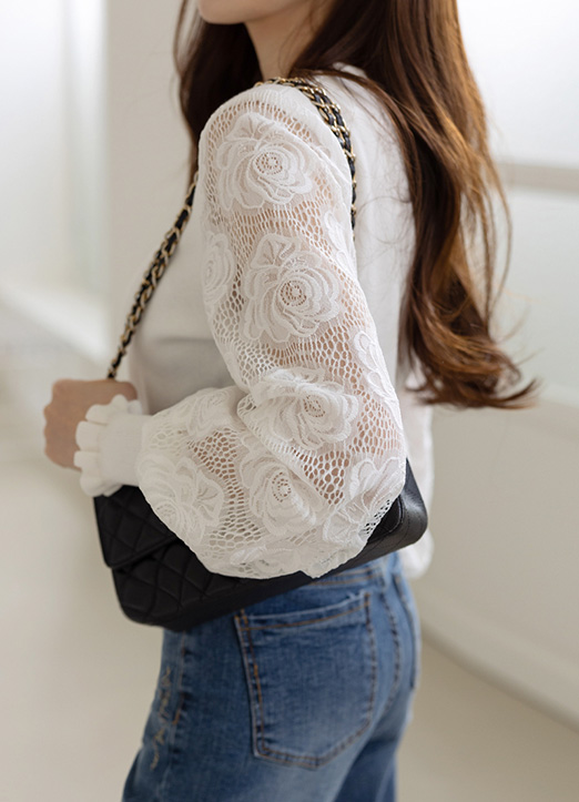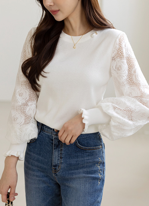 펀칭 레이스로 볼륨감있는 퍼프 소매를 연출해주며