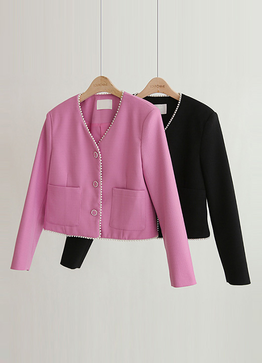 진주로 테두리 라인을 둘러 화사하게 포인트를 준 트위드 자켓이에요 :)