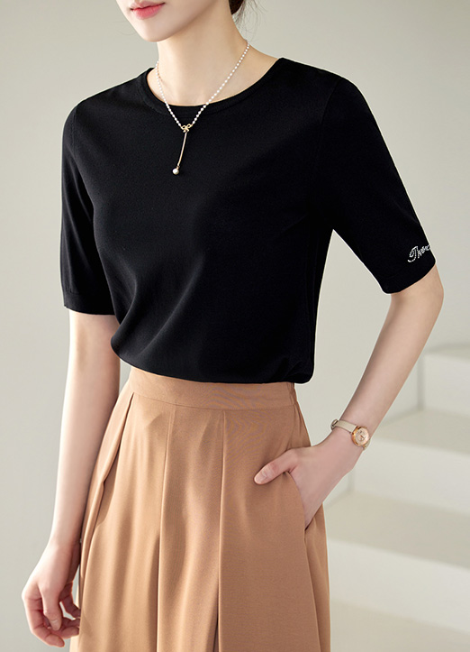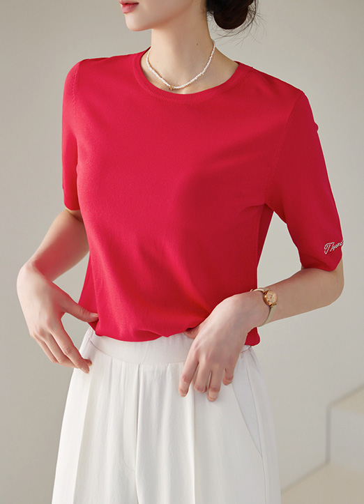 깔끔한 디자인에 소매 비즈레터링으로 화사한 포인트를 준 니트