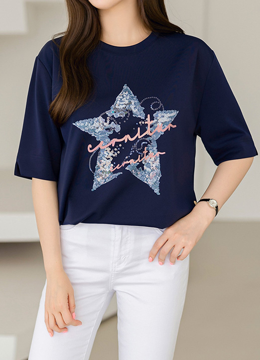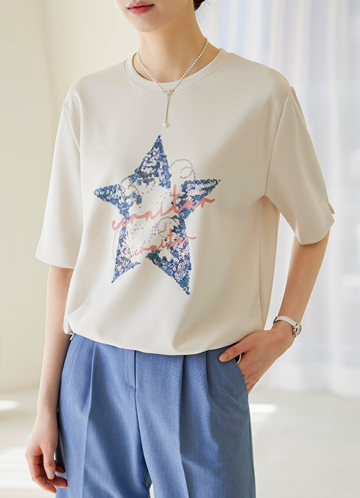 스팽글을 붙인 듯 별 패턴으로 화사함이 느껴지는 스트링 티셔츠