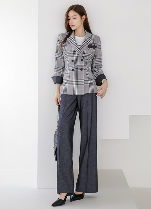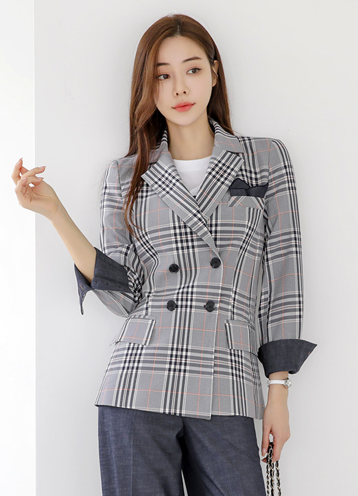 ハンカチーフ付きデニム配色チェックダブルジャケット jk24907