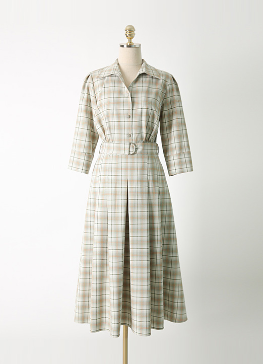 [THE ONME] ウエストベルト オープンカラーチェックワンピース op25159