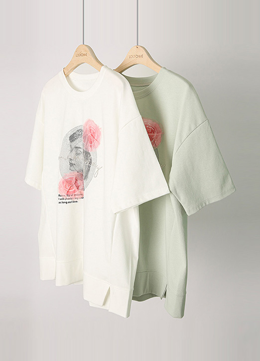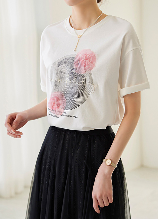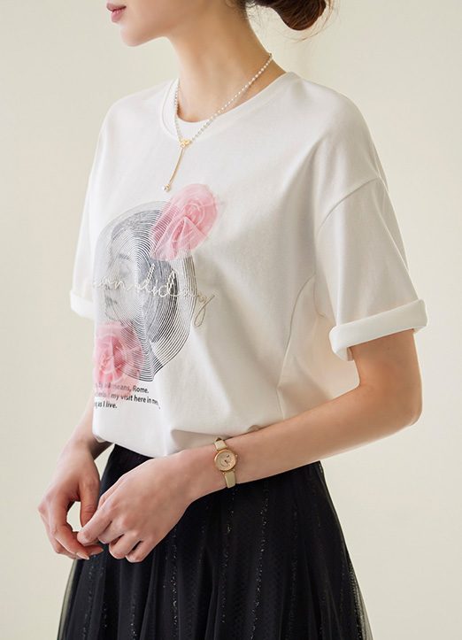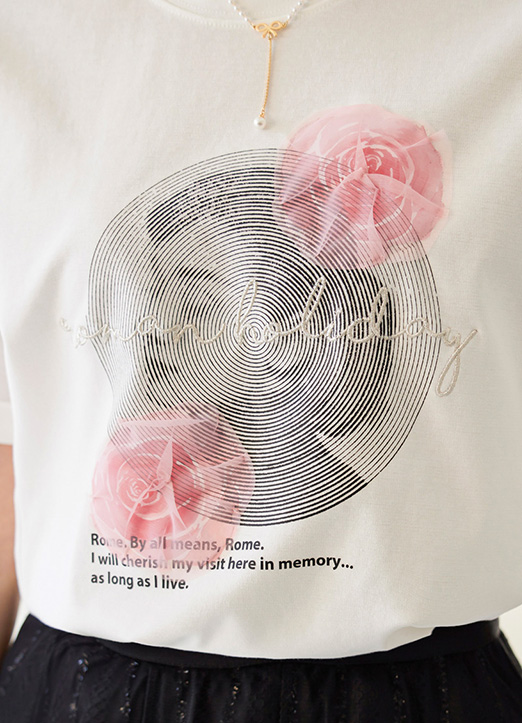 로즈 프린팅에 레이스가 더해져 입체적으로 연출되는 러블리 티셔츠