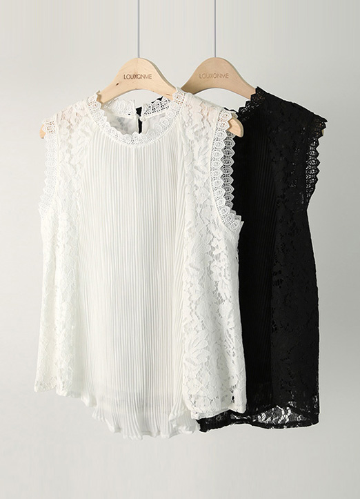 アシンメトリデザインのシアープリーツとレースのコンビが絶妙なノースリーブブラウス。ジャケットのインナーはもちろん、単品でも今から夏まで着回しに重宝するトップス!