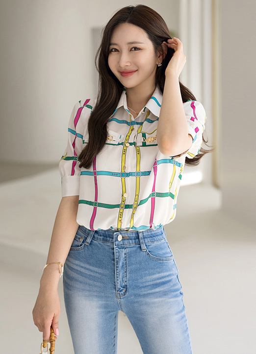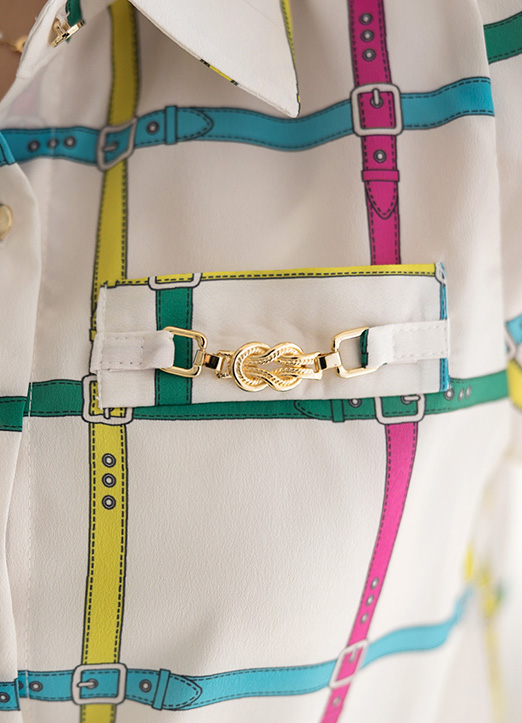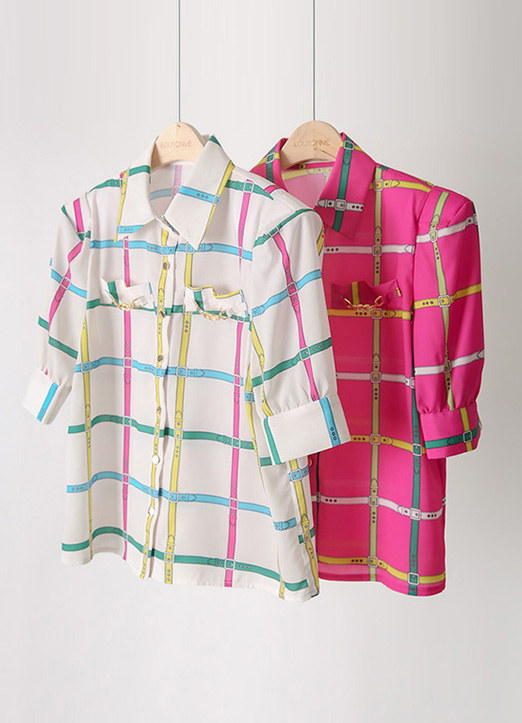 ゴールドチェーンポケット ビビットチェックプリントブラウス bl25383