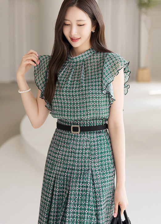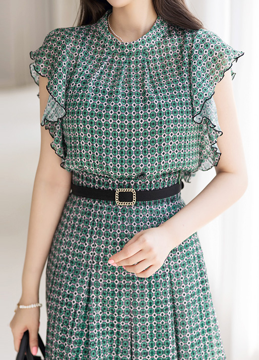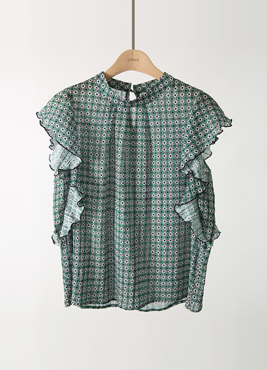 【セットアップ可能】[Louis Angel] エスニック幾何柄フレンチスリーブフリルブラウス bl25423