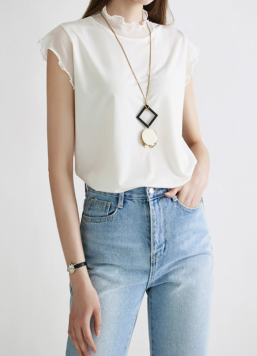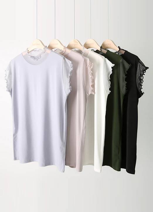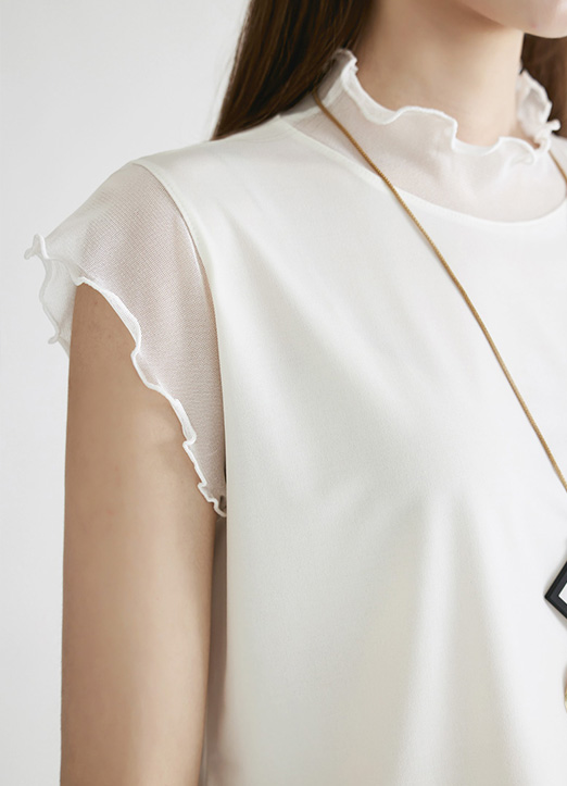 소매와 목 부분이 시스루한 소재로 배색되어있어