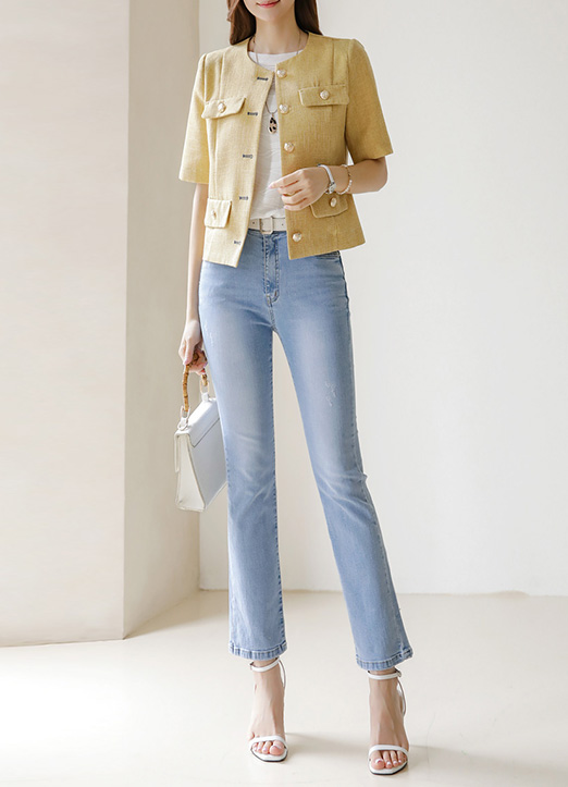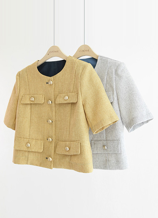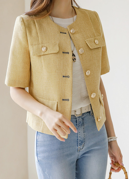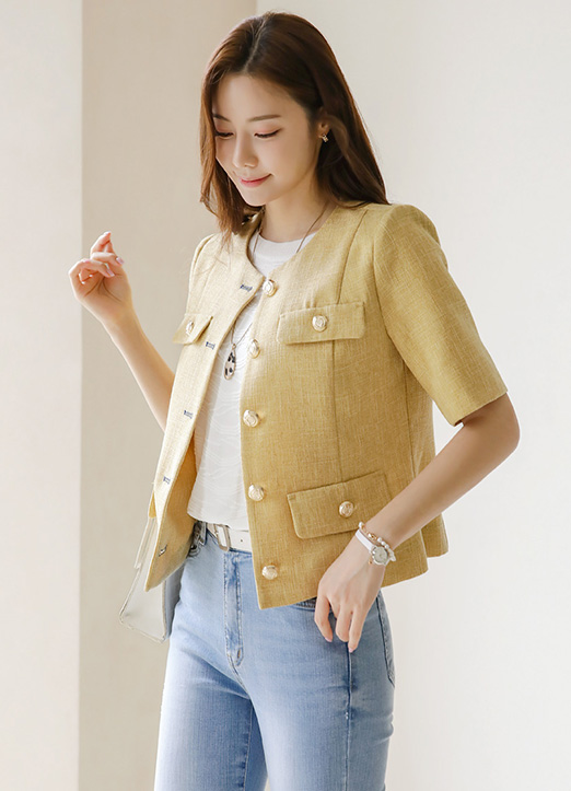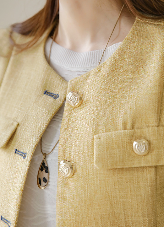 ノーカラーゴールドボタンリネンライククロップドジャケット jk25943