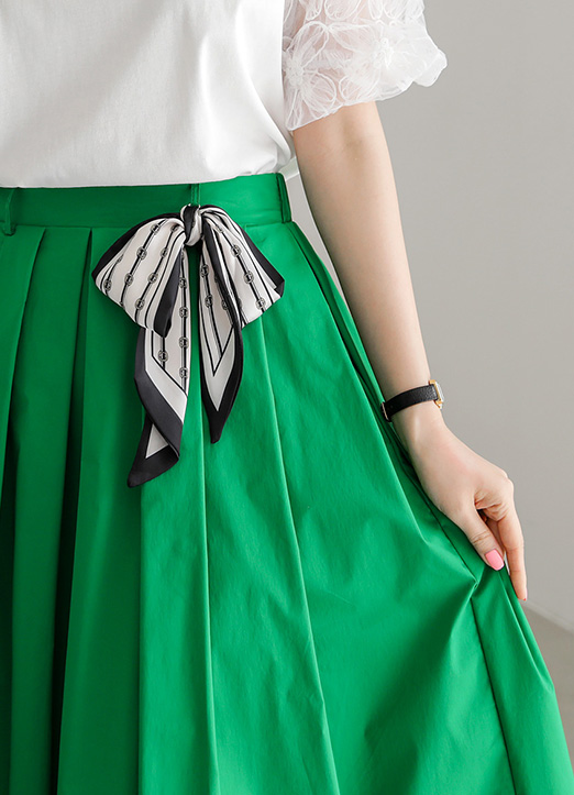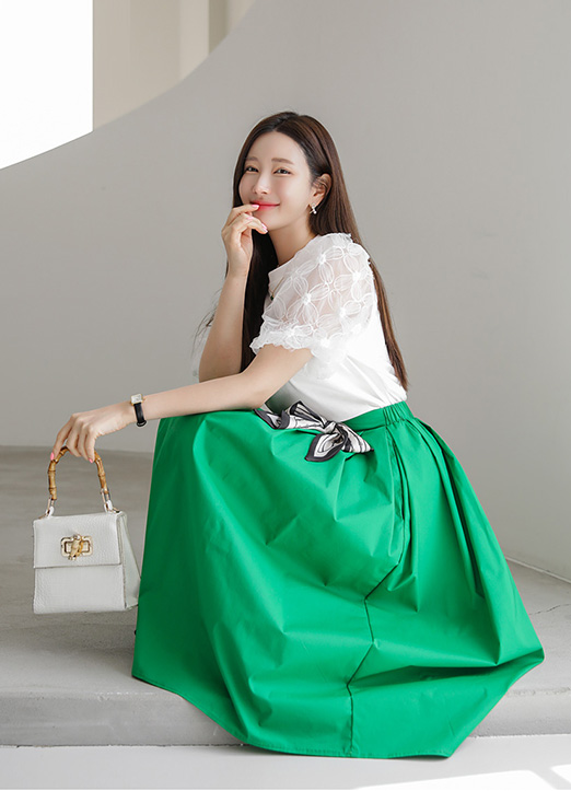 플리츠가 잡혀 더욱 풍성한 플레어 라인을 연출해주고