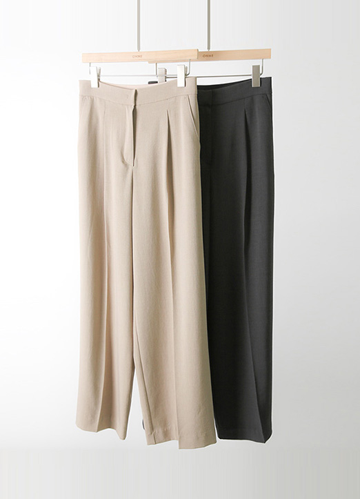 원턱으로 잡아준 여유감있는 세미 와이드 품에 뒷 밴딩 디자인으로