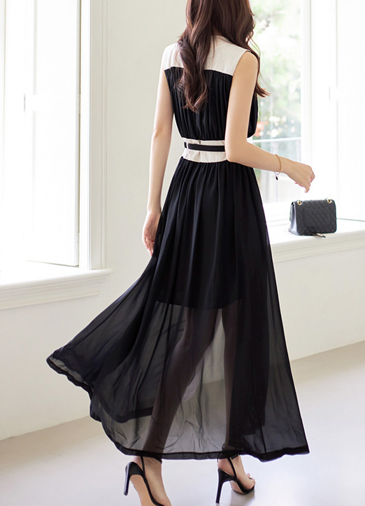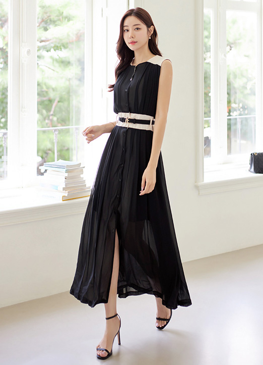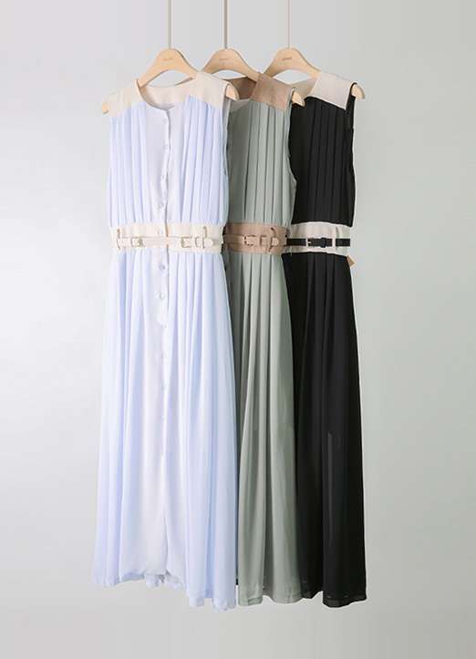 ベルトSETノースリーブ配色プリーツシアーマキシワンピース op27715