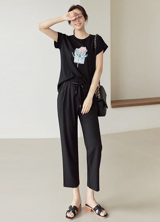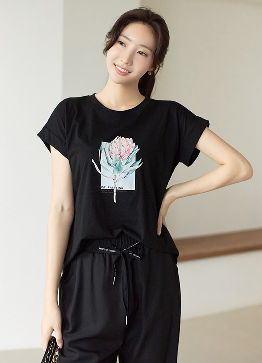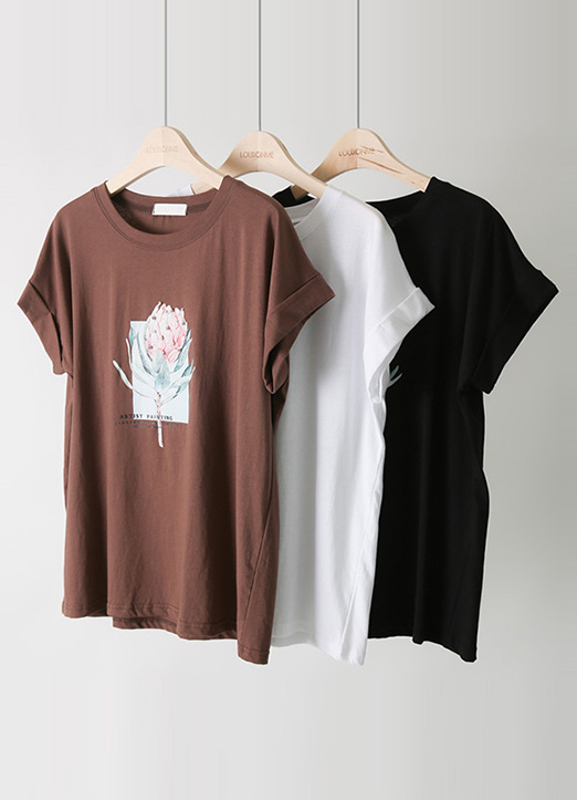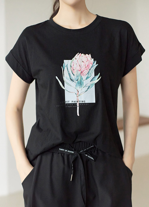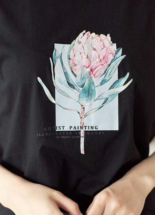パールビジュー付きフラワープリントロールアップTシャツ ts27926