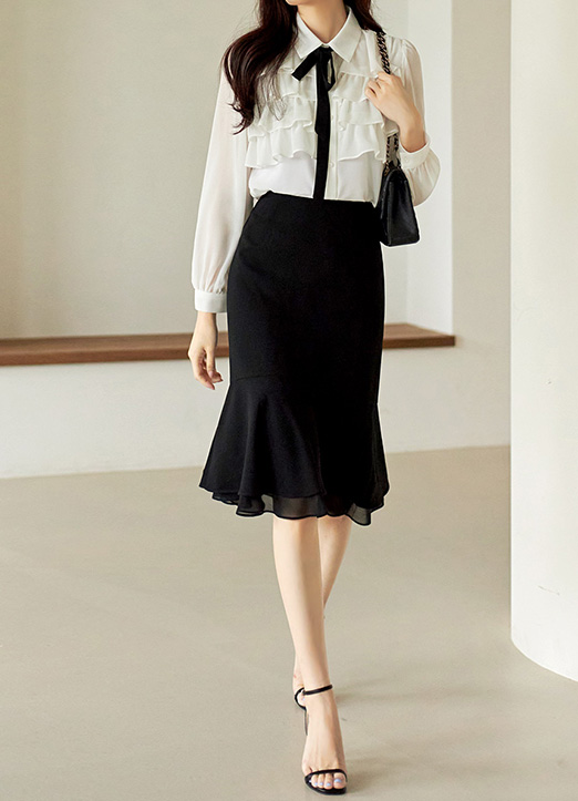 밑단에 시스루 쉬폰이 덧대어진 플레어 머메이드 디자인으로