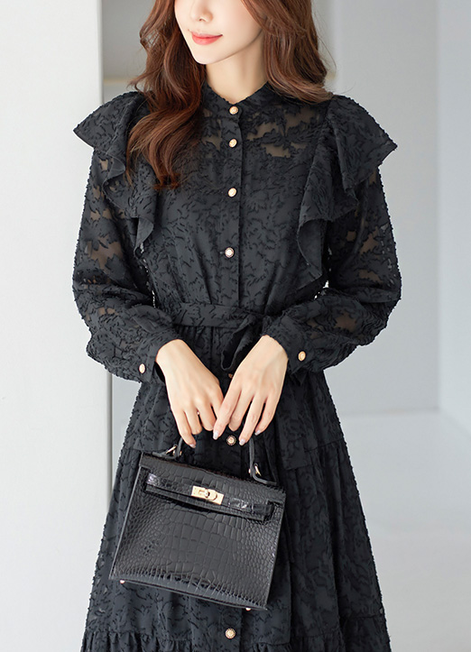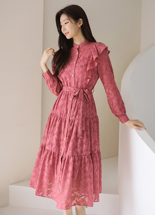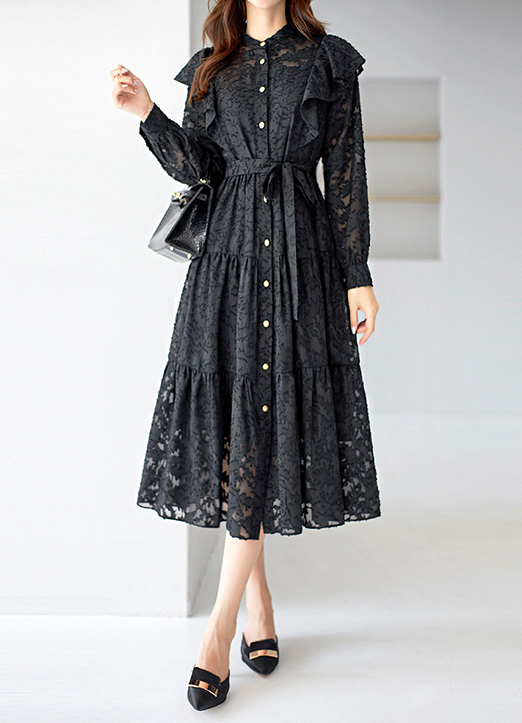 [LouisAngel] ウエストリボン付きフラワーレースフリルティアードワンピース op28542